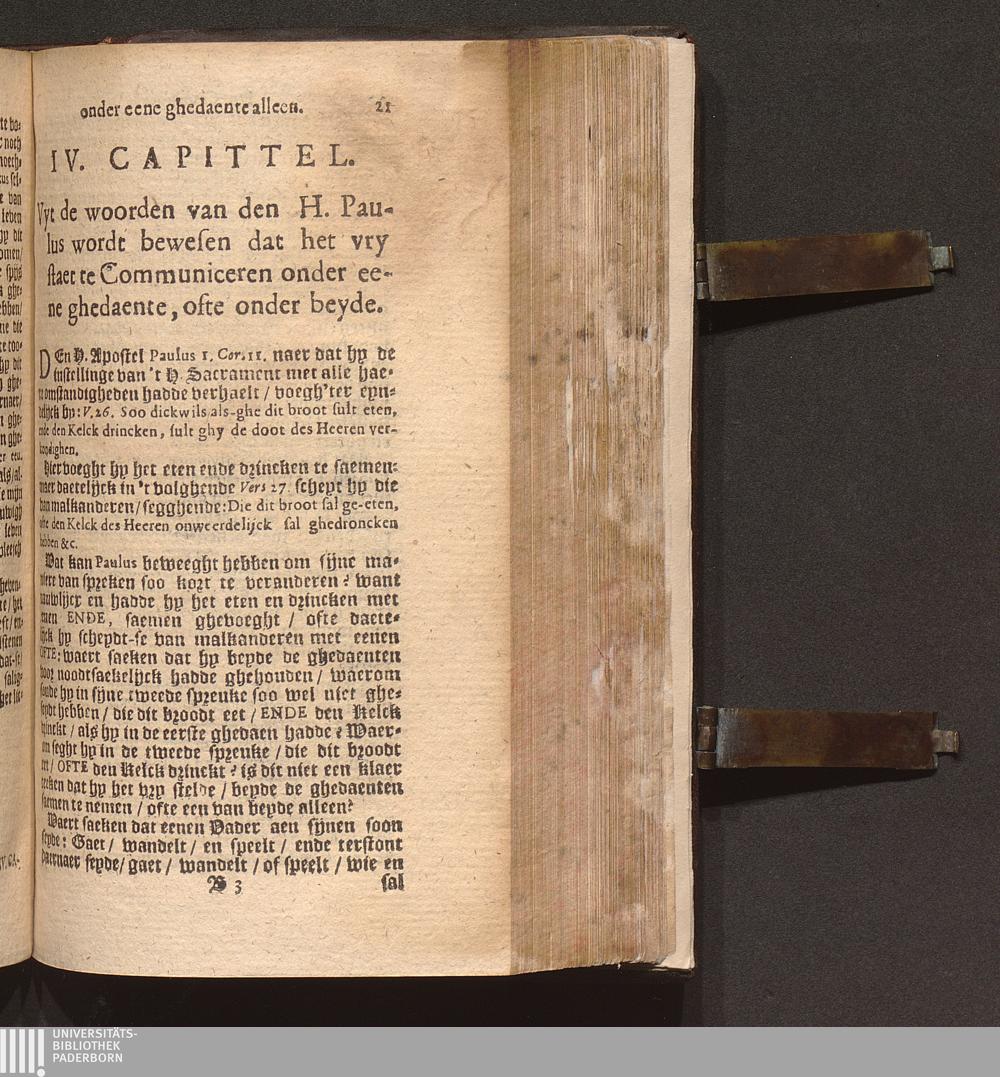 IV. Capittel. Vyt de woorden van den H. Paulus wordt bewesen dat het vry staet te Communiceren onder eene ghedaente, ofte onder beyde.