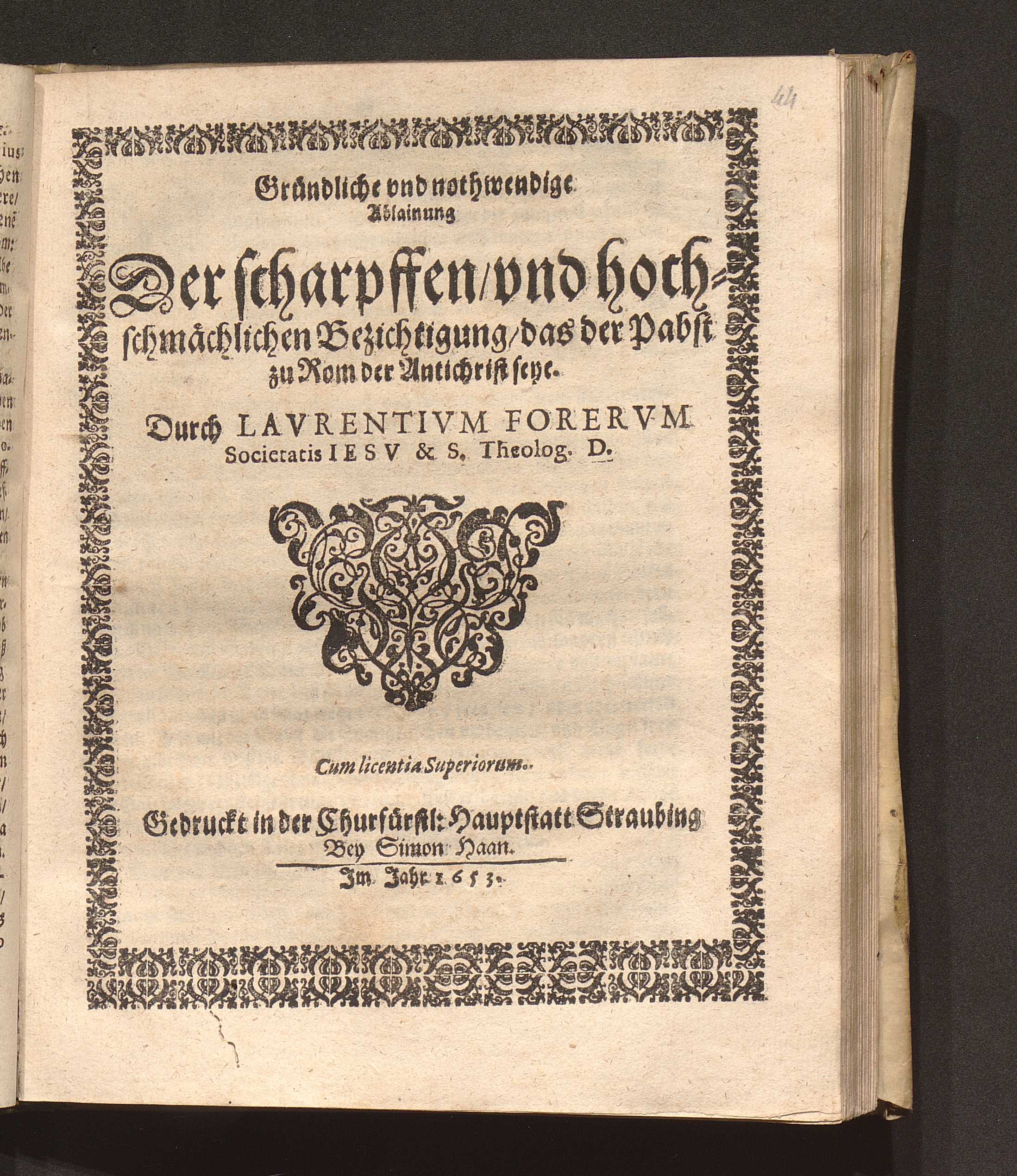 Gründliche vnd nothwendige Ablainung Der scharpffen/ vnd hochschmächlichen Bezichtigung/ das der Pabst zu Rom der Antichrist seye / Durch Lavrentivm Forervm Societatis Iesv & S. Theolog. D.