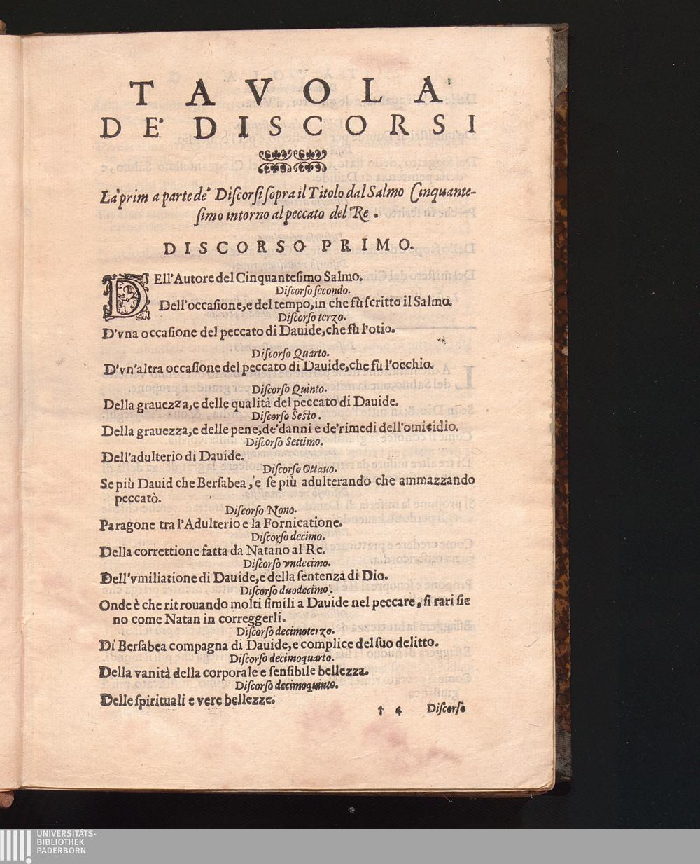 Tavola De Discorsi. La'prim a partede'Discorsi sopra il Titolo dal Salmo Cinquantesimo[...]