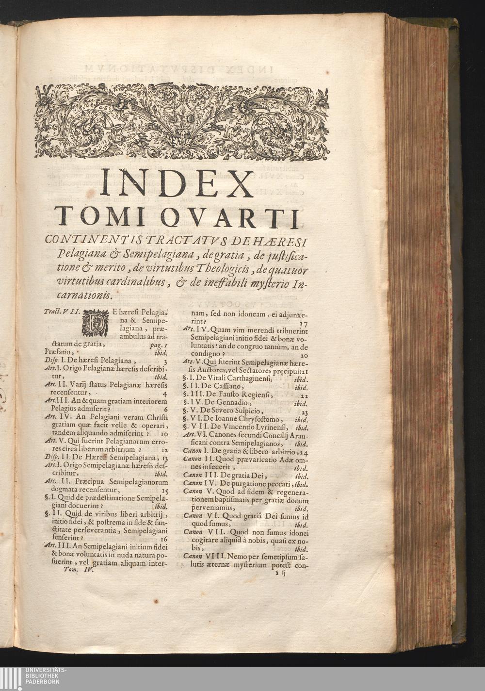 Tomvs Qvartvs (1669) Continens Tractatus de erroribus Pelagianorum, de Gratia, de Iustificatione & Merito, de Virtutibus Theologicis, & quatuor Cardinalibus, ac de ineffabili mysterio Incarnationis