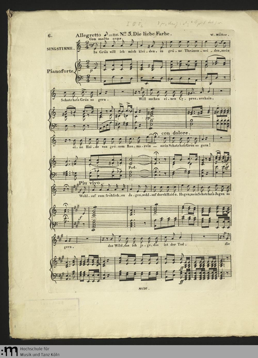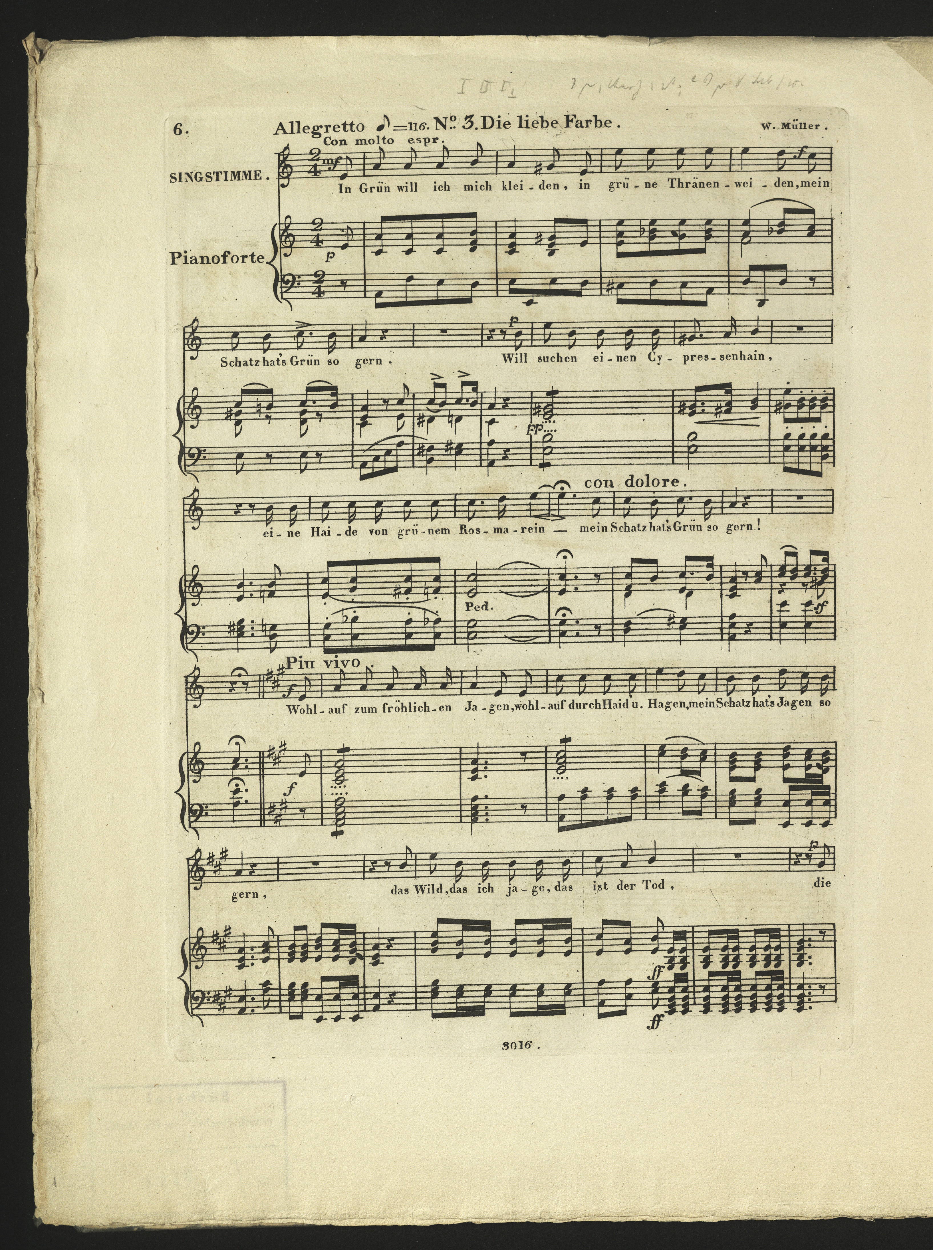 No 3. Die liebe Farbe. Con molto espressivo [In Grün will ich mich kleiden, in grünen Thränen weiden] / W. Müller
