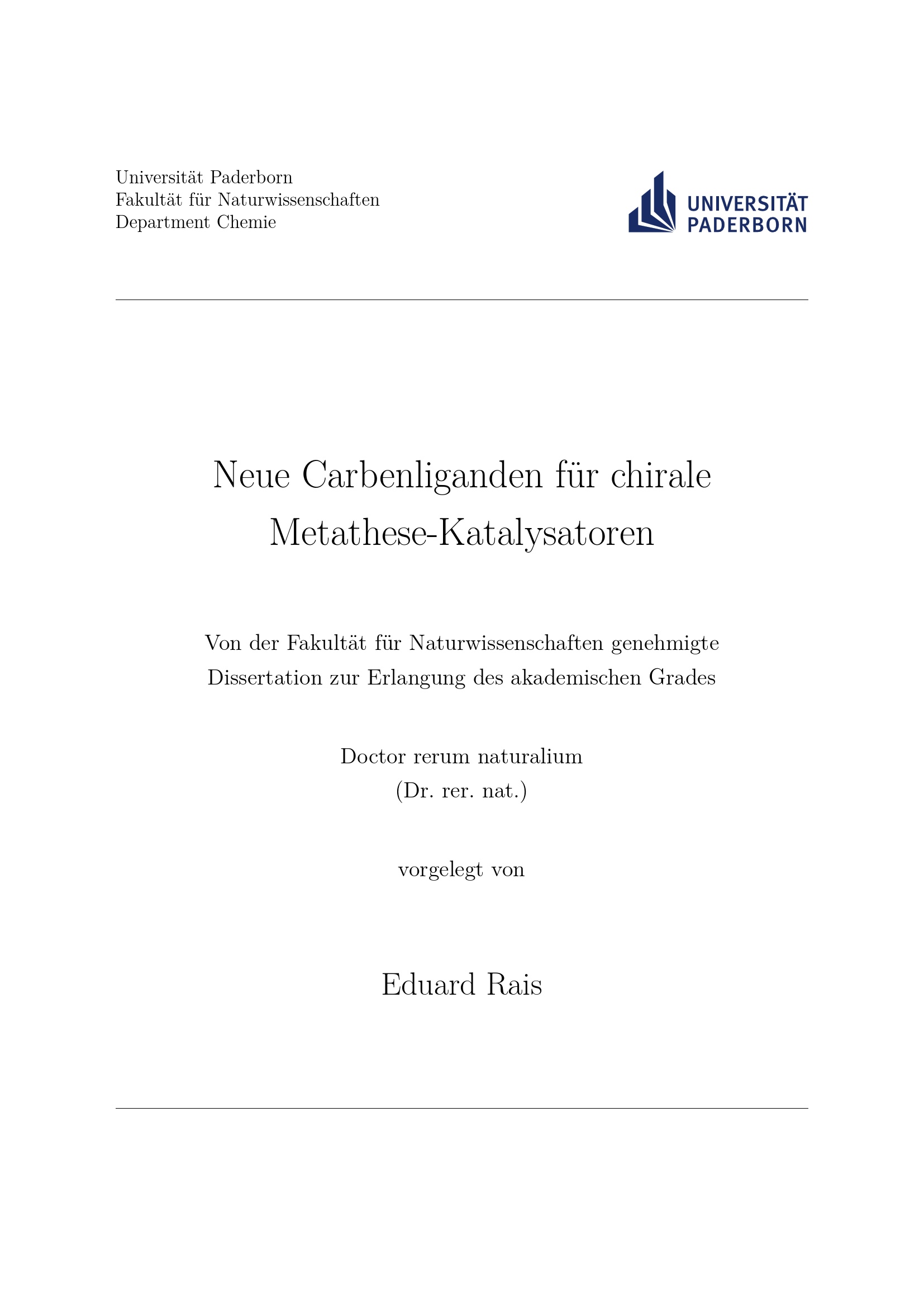 Neue Carbenliganden für chirale Metathese-Katalysatoren / vorgelegt von Eduard Rais ; [Erstgutachter: Prof. Dr. René Wilhelm, Zweitgutachter: Prof. Dr. Dirk Kuckling]