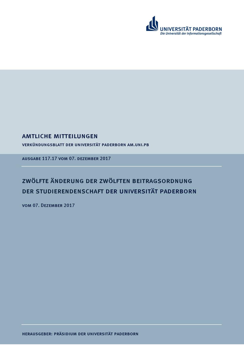 Zwölfte Änderung der zwölften Beitragsordnung der Studierendenschaft der Universität Paderborn : vom 07. Dezember 2017