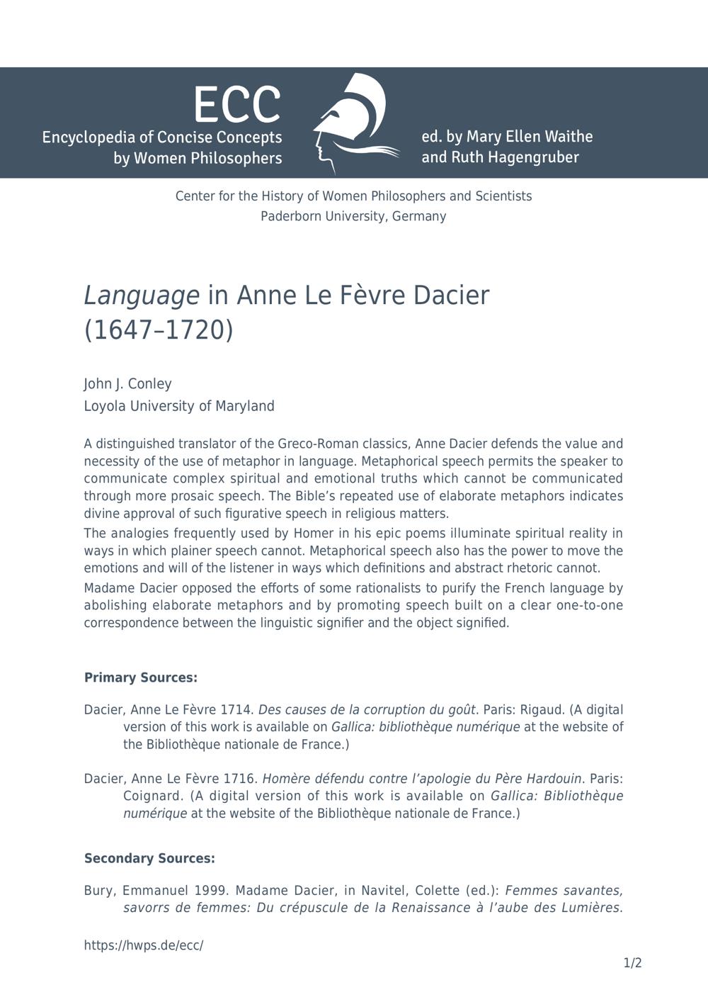 Language in Anne Le Fèvre Dacier (1647-1720) / John J. Conley, Loyola University of Maryland