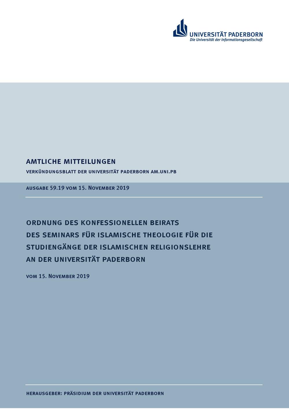 Ordnung des konfessionellen Beirats des Seminars für Islamische Theologie für die Studiengänge der islamischen Religionslehre an der Universität Paderborn : vom 15. November 2019