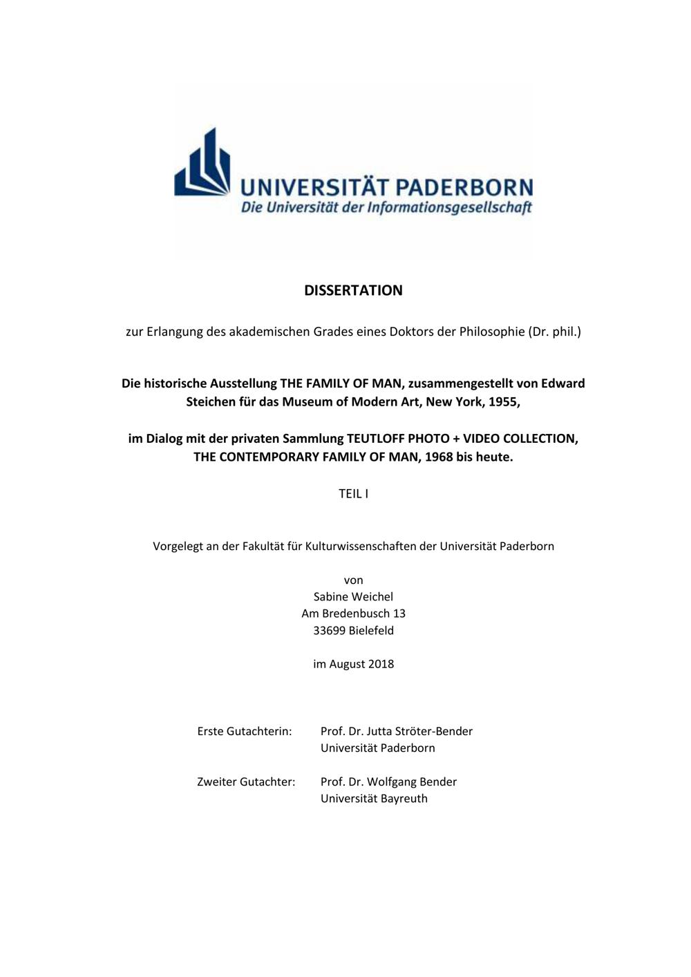 Die historische Ausstellung THE FAMILY OF MAN, zusammengestellt von Edward Steichen für das Museum of Modern Art, New York, 1955, im Dialog mit der privaten Sammlung TEUTLOFF PHOTO + VIDEO COLLECTION, THE CONTEMPORARY FAMILY OF MAN, 1968 bis heute. / von Sabine Weichel ; Erste Gutachterin: Prof. Dr. Jutta Ströter-Bender (Universität Paderborn), Zweiter Gutachter: Prof. Dr. Wolfgang Bender (Universität Bayreuth)