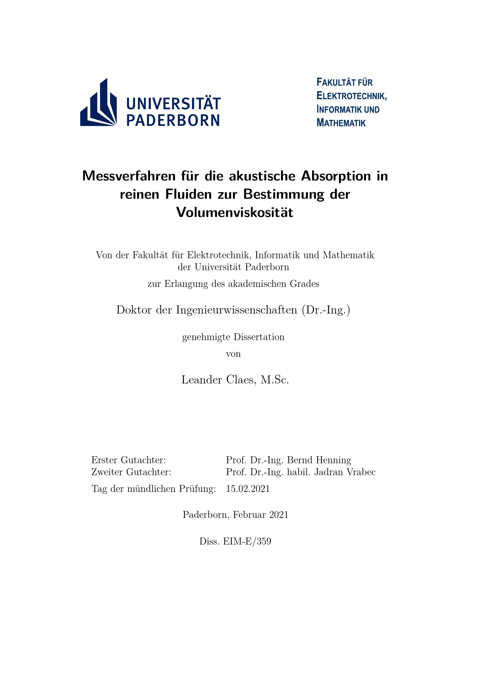 Messverfahren für die akustische Absorption in reinen Fluiden zur Bestimmung der Volumenviskosität / von Leander Claes, M.Sc. ; Erster Gutachter: Prof. Dr.-Ing. Bernd Henning, Zweiter Gutachter: Prof. Dr.-Ing. habil. Jadran Vrabec