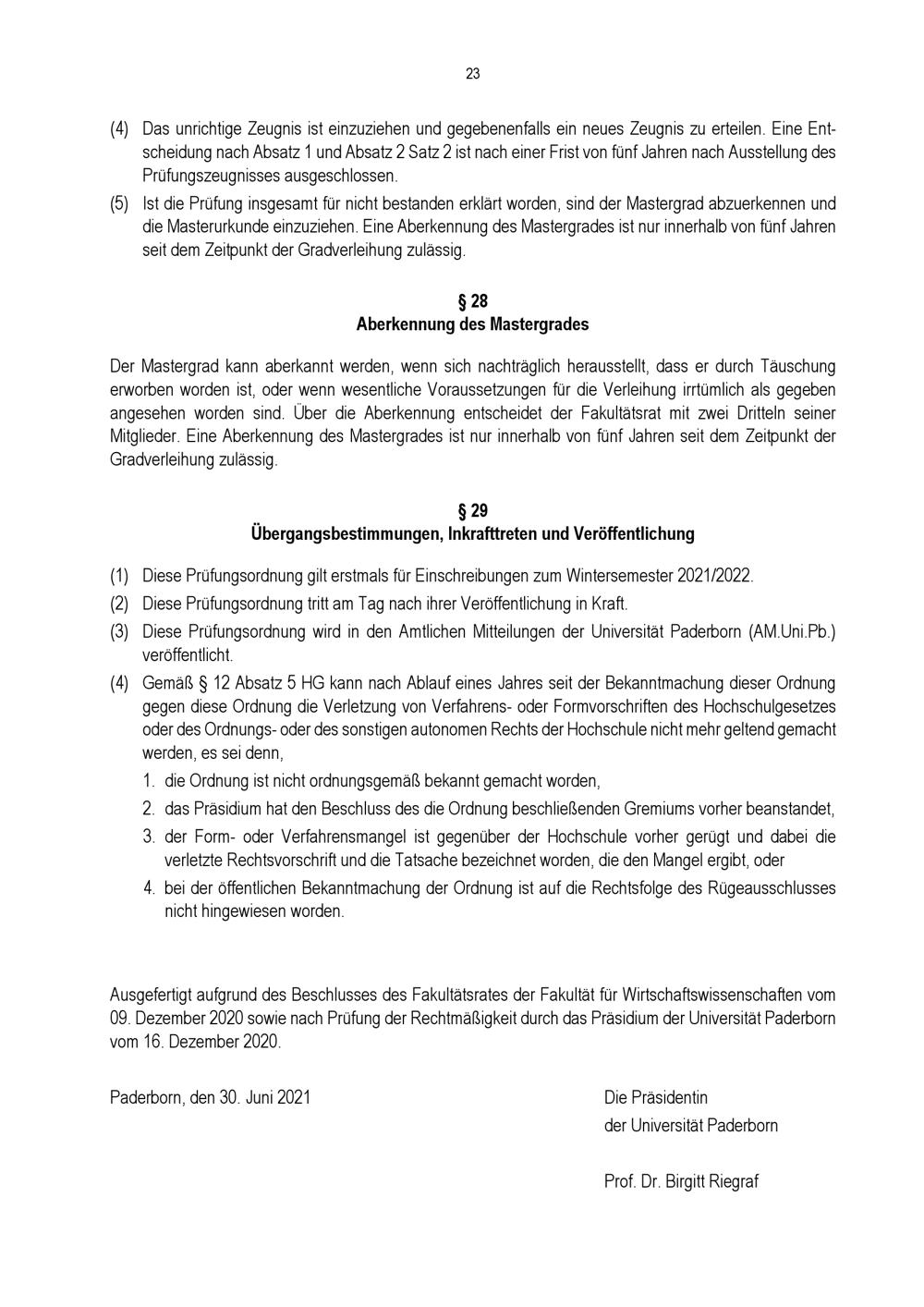 Prüfungsordnung für den Masterstudiengang Management der Fakultät für Wirtschaftswissenschaften an der Universität Paderborn : vom 30. Juni 2021