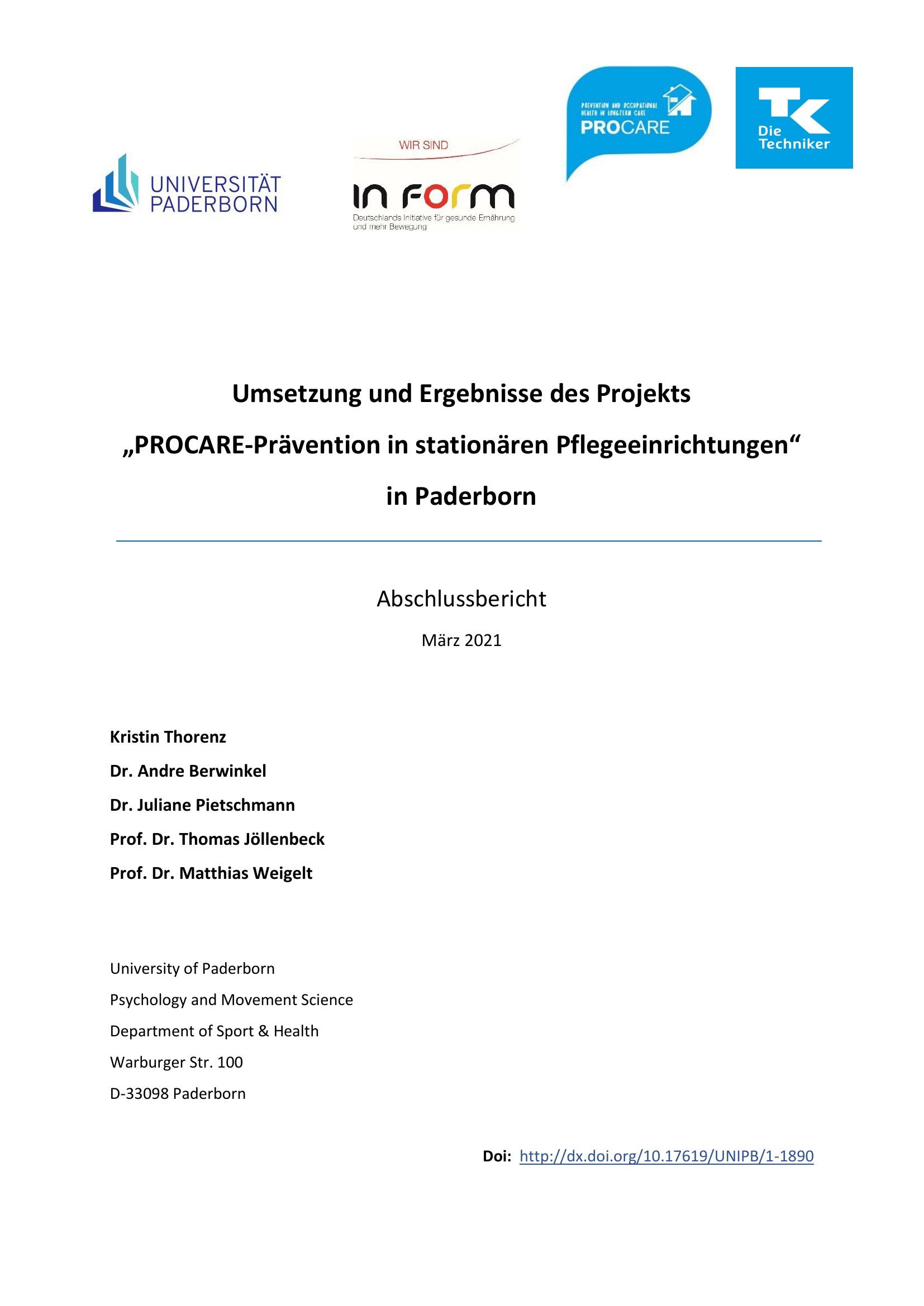 Umsetzung und Ergebnisse des Projekts „PROCARE-Prävention in stationären Pflegeeinrichtungen“ in Paderborn : Abschlussbericht : März 2021 / Kristin Thorenz, Dr. Andre Berwinkel, Dr. Juliane Pietschmann, Prof. Dr. Thomas Jöllenbeck, Prof. Dr. Matthias Weigelt