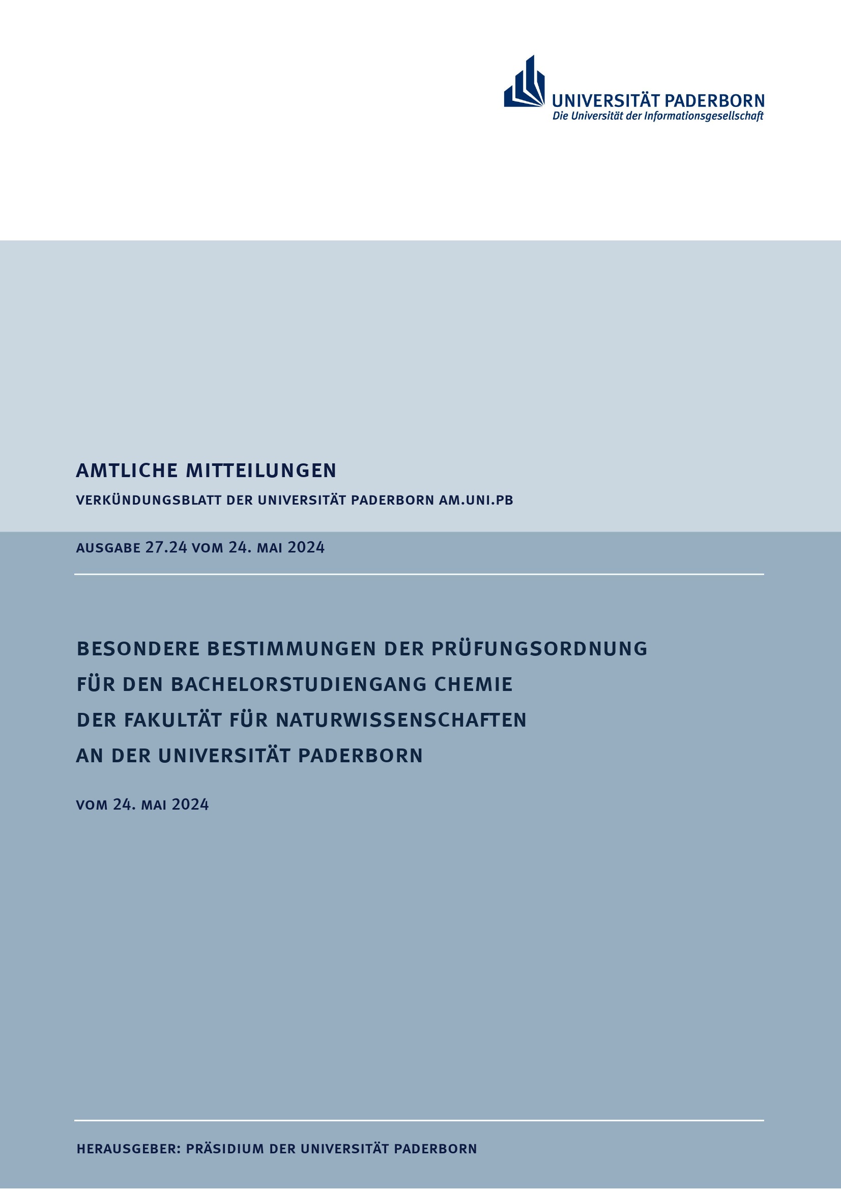 Besondere Bestimmungen der Prüfungsordnung für den Bachelorstudiengang Chemie der Fakultät für Naturwissenschaften an der Universität Paderborn : vom 24. Mai 2024