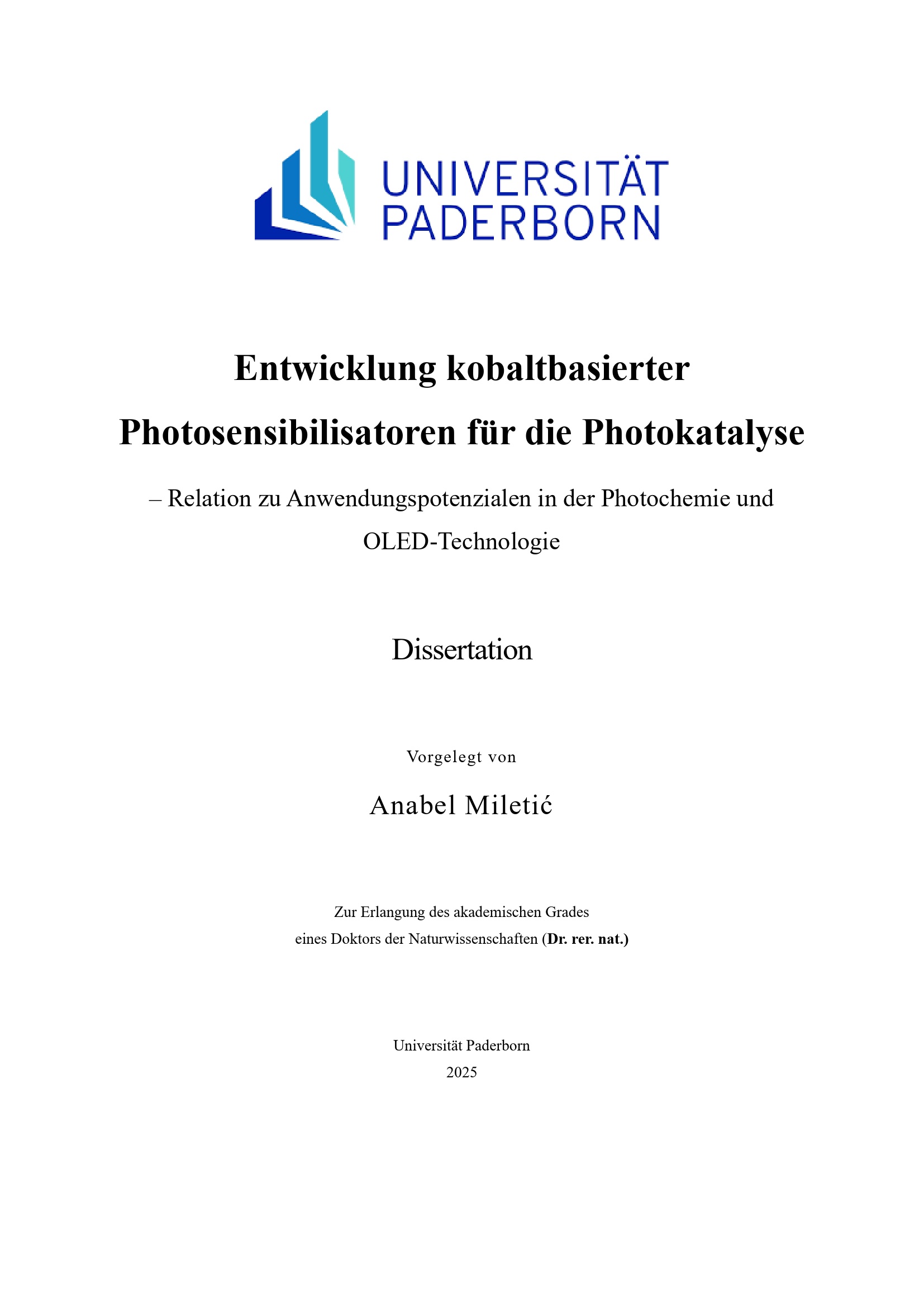 Entwicklung kobaltbasierter Photosensibilisatoren für die Photokatalyse : Relation zu Anwendungspotenzialen in der Photochemie und OLED-Technologie / Anabel Miletic ; Prof. Dr. Matthias Bauer Erstgutachter, PD Dr. Hans Egold Zweitgutachter