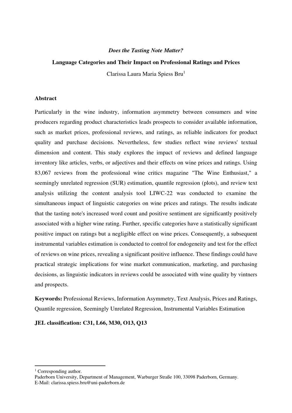 Does the tasting note matter? : language categories and their impact on professional ratings and prices / Clarissa Laura Maria Spiess Bru
