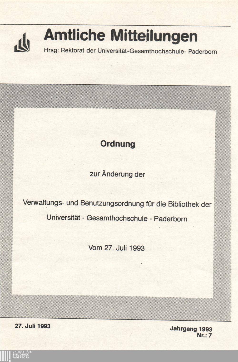 Ordnung zur Änderung der Verwaltungs- und Benutzungsordnung für die Bibliothek der Universität - Gesamthochschule - Paderborn : vom 27. Juli 1993