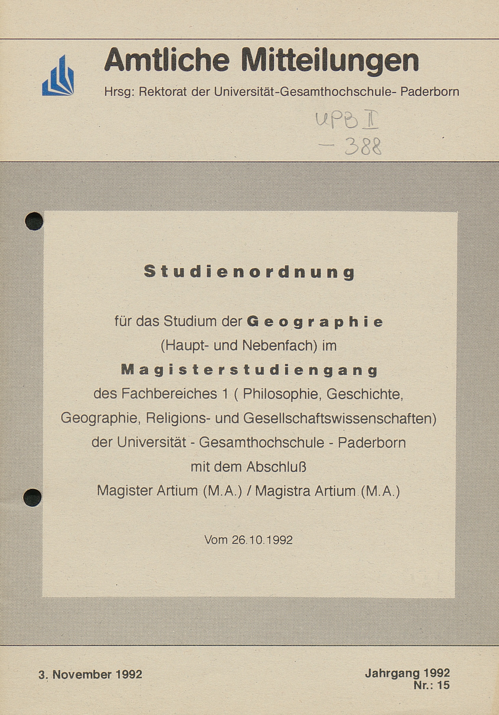 Studienordnung für das Studium der "Geographie" (Haupt- und Nebenfach) im "Magisterstudiengang" des Fachbereichs 1 (Philosophie, Geschichte, Geographie, Religions- und Gesellschaftswisssenschaften) der Universität - Gesamthochschule - Paderborn mit dem Abschluß Magister Artium (M.A.), Magistra Artium (M.A.) : vom 26.10.1992