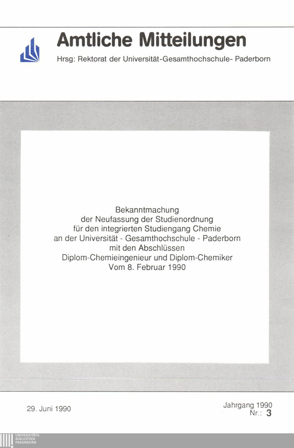 Bekanntmachung der Neufassung der Studienordnung für den integrierten Studiengang Chemie an der Universität - Gesamthochschule - Paderborn mit den Abschlüssen Diplom-Chemieingenieur und Diplom-Chemiker vom 8. Februar 1990 : 29. Juni 1990