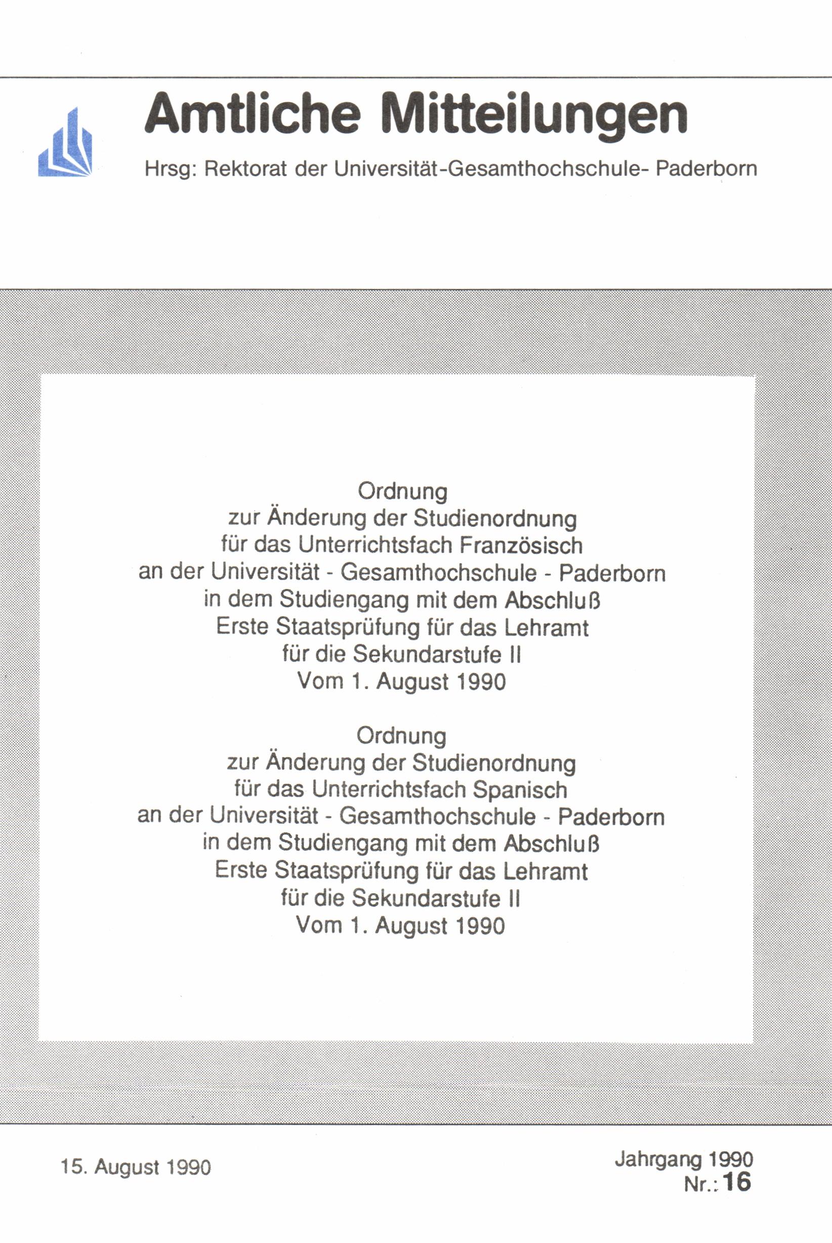 Ordnung zur Änderung der Studienordnung für das Unterrichtsfach Französisch an der Universität - Gesamthochschule - Paderborn in dem Studiengang mit dem Abschluß Erste Staatsprüfung für das Lehramt für die Sekundarstufe II vom 1. August 1990