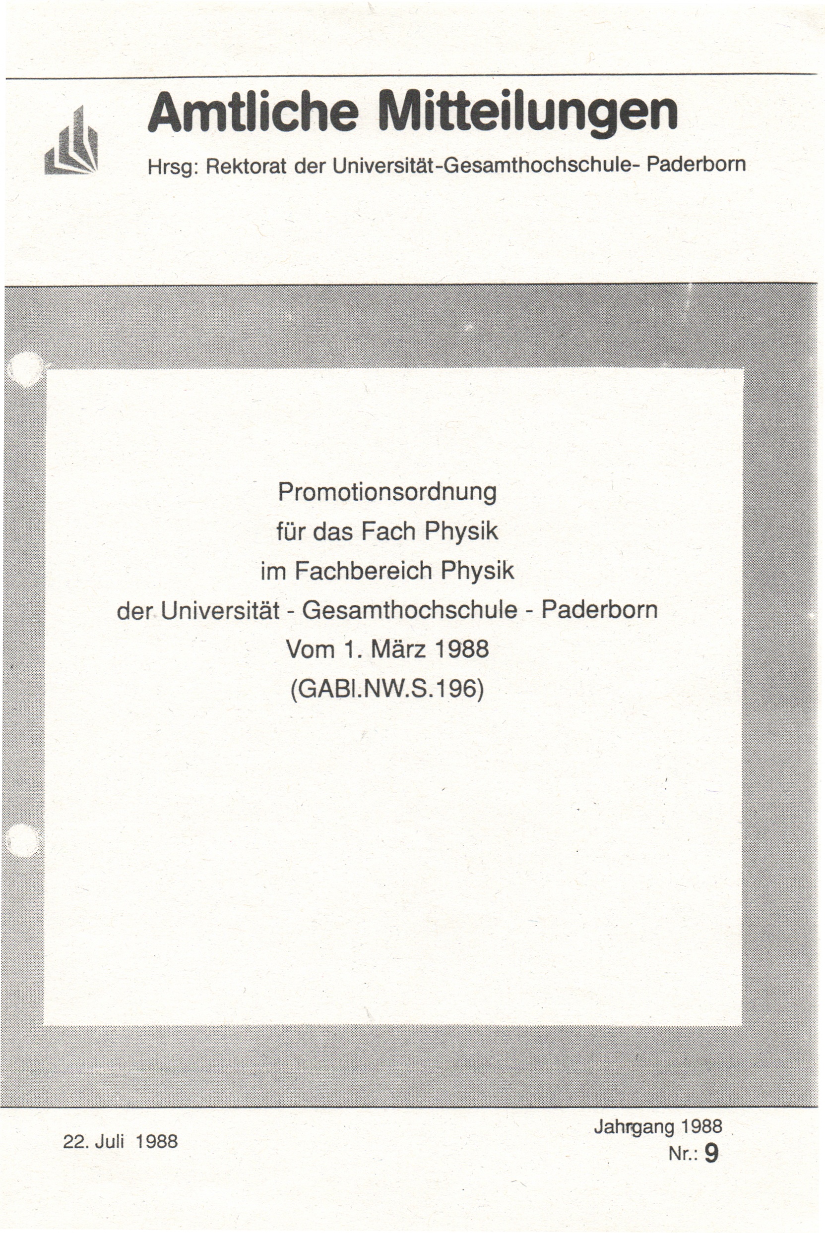 Promotionsordnung für das Fach Physik im Fachbereich Physik der Universität-Gesamthochschule-Paderborn : vom 1. März 1988