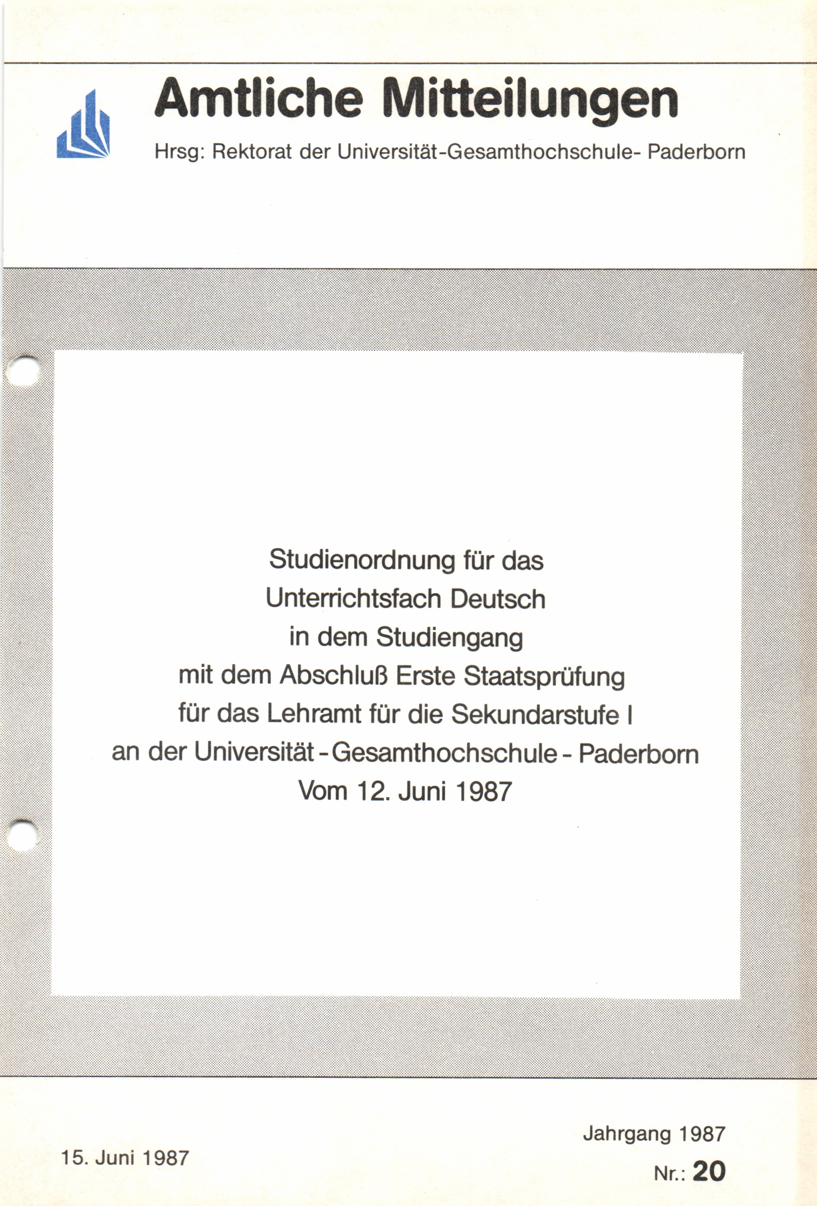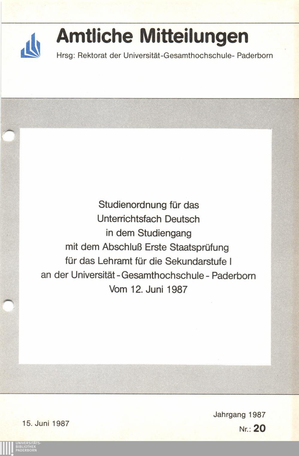 Studienordnung für das Unterrichtsfach Deutsch in dem Studiengang mit dem Abschluß Erste Staatsprüfung für das Lehramt für die Sekundarstufe I an der Universität-Gesamthochschule-Paderborn : vom 12. Juni 1987