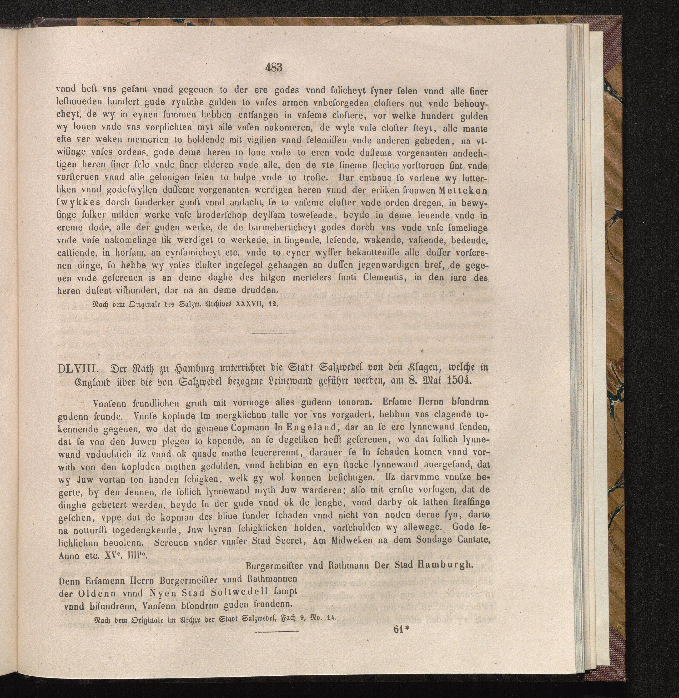 DLVIII. Der Rath zu Hamburg unterrichtet die Stadt Salzwedel von den Klagen, welche[...]