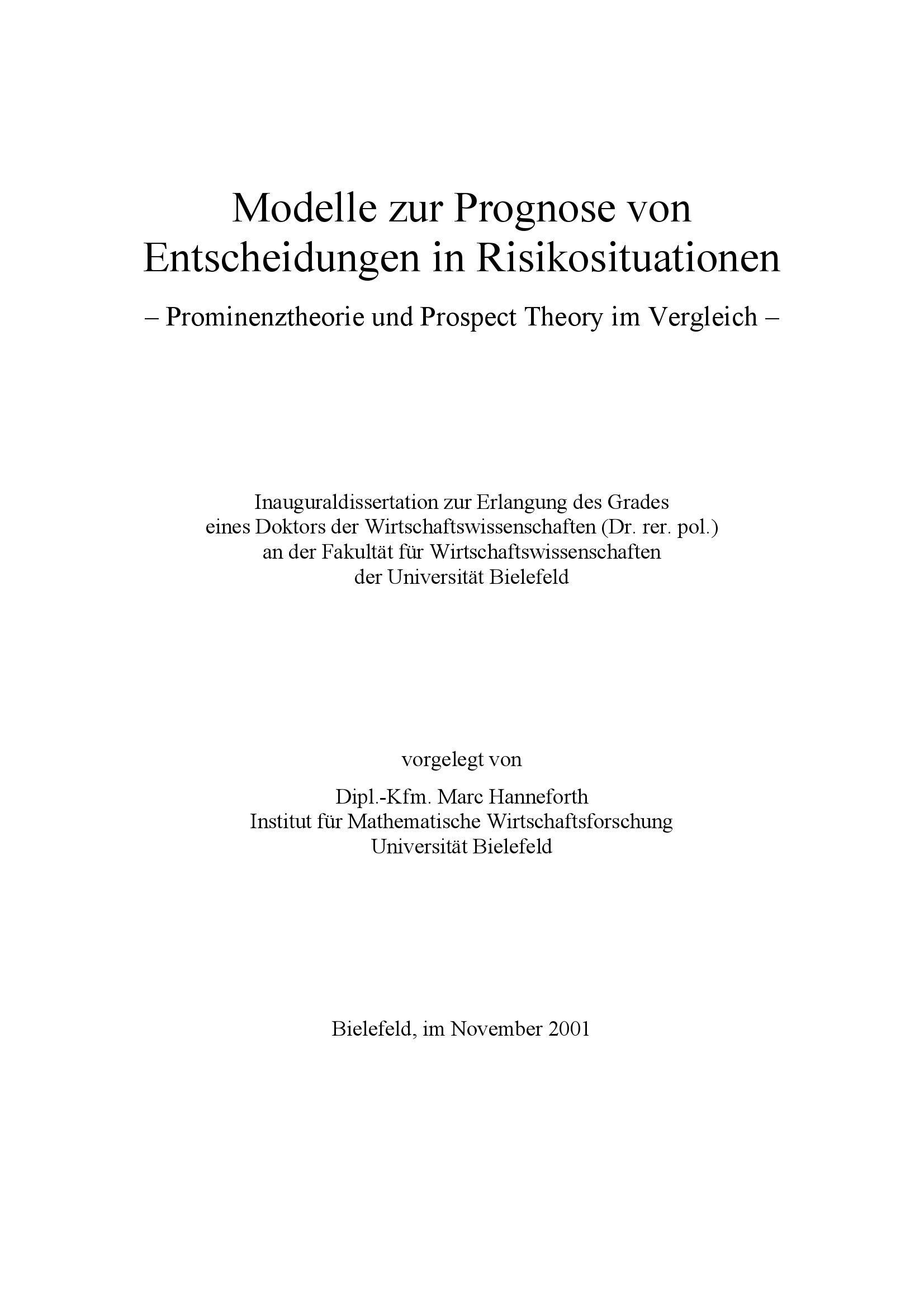 Modelle zur Prognose von Entscheidungen in Risikosituationen : Prominenztheorie und prospect theory im Vergleich