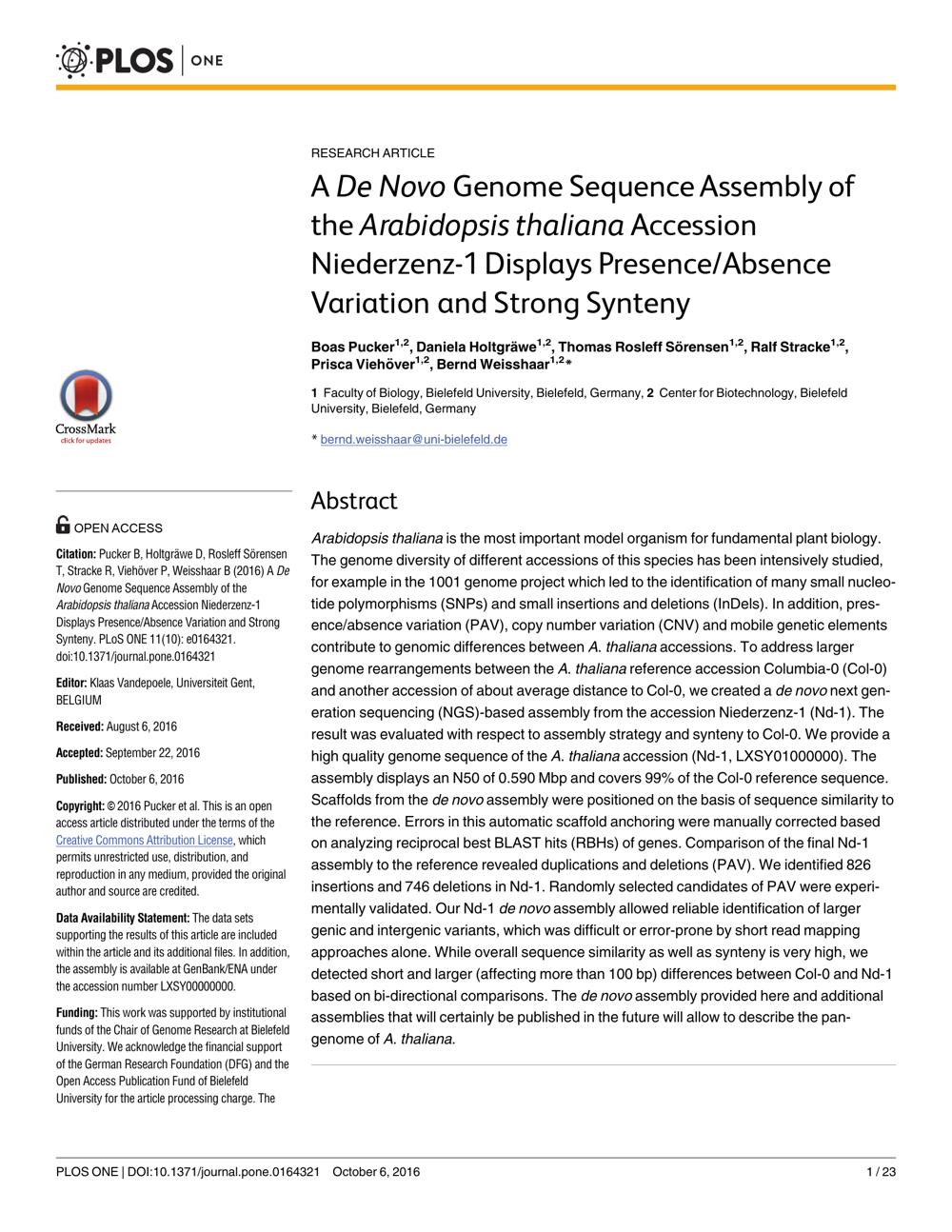A de novo Genome Sequence Assembly of the Arabidopsis thaliana Accession Niederzenz-1 Displays Presence/Absence Variation and Strong Synteny