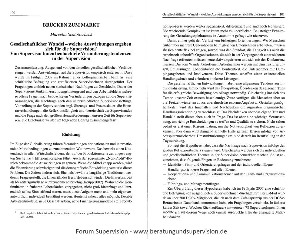 BRÜCKEN ZUM MARKT : Gesellschaftlicher Wandel - welche Auswirkungen ergeben sich für die Supervision? Von Supervisor Innen beobachtete Veränderungstendenzen in der Supervision