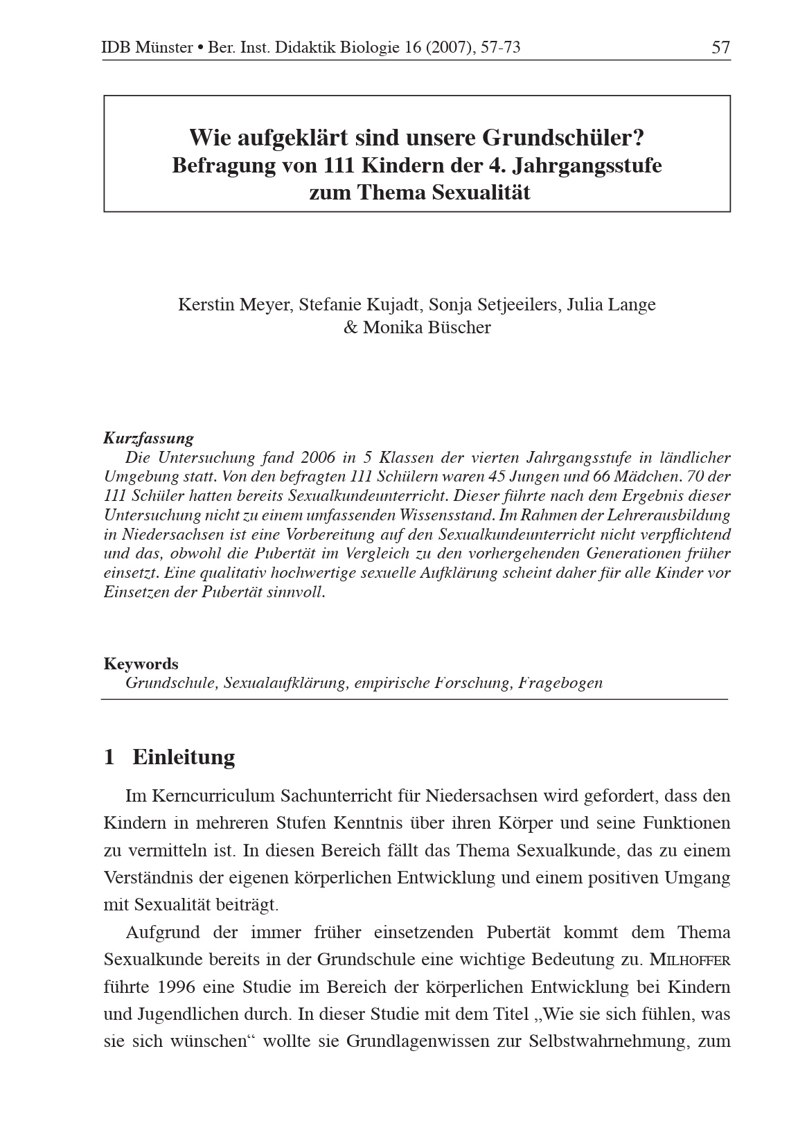 Wie aufgeklärt sind unsere Grundschüler? Befragung von 111 Kindern der 4. Jahrgangsstufe zum Thema Sexualität