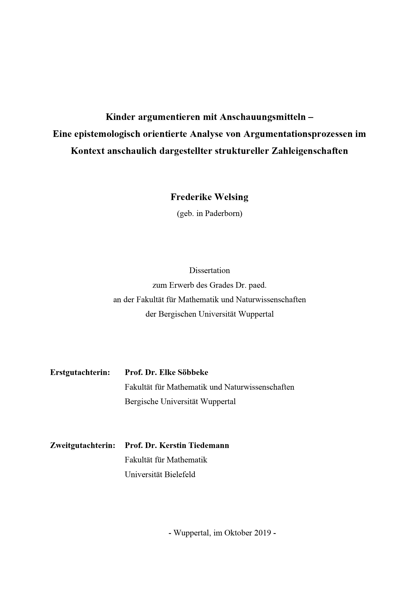 Kinder argumentieren mit Anschauungsmitteln : eine epistemologisch orientierte Analyse von Argumentationsprozessen im Kontext anschaulich dargestellter struktureller Zahleigenschaften / Frederike Welsing