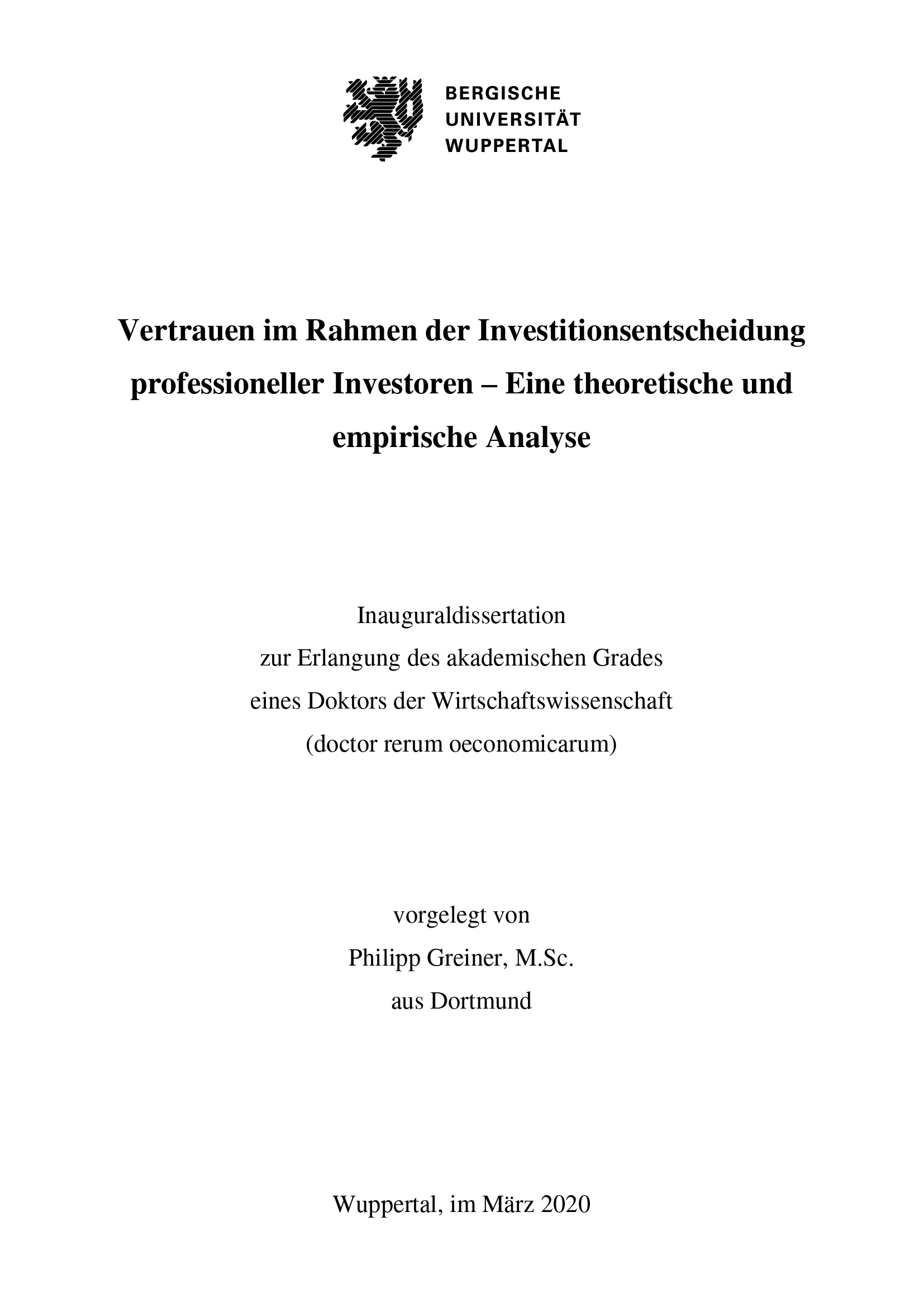 Vertrauen im Rahmen der Investitionsentscheidung professioneller Investoren : eine theoretische und empirische Analyse / vorgelegt von Philipp Greiner, M. Sc. aus Dortmund
