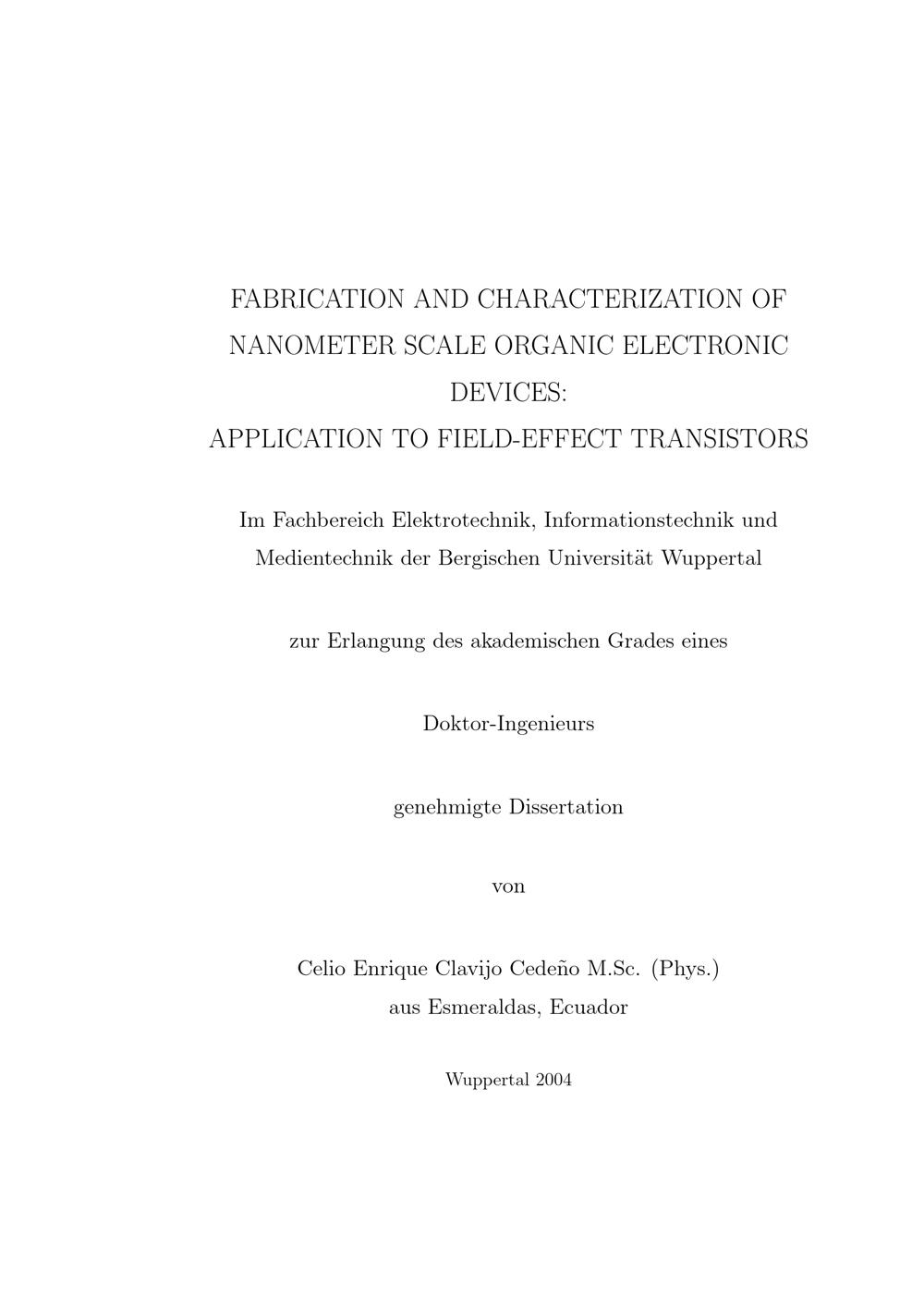 Fabrication and characterization of nanometer scale organic electronic devices : application to field effect transistors / von Celio Enrique Clavijo Cedeño