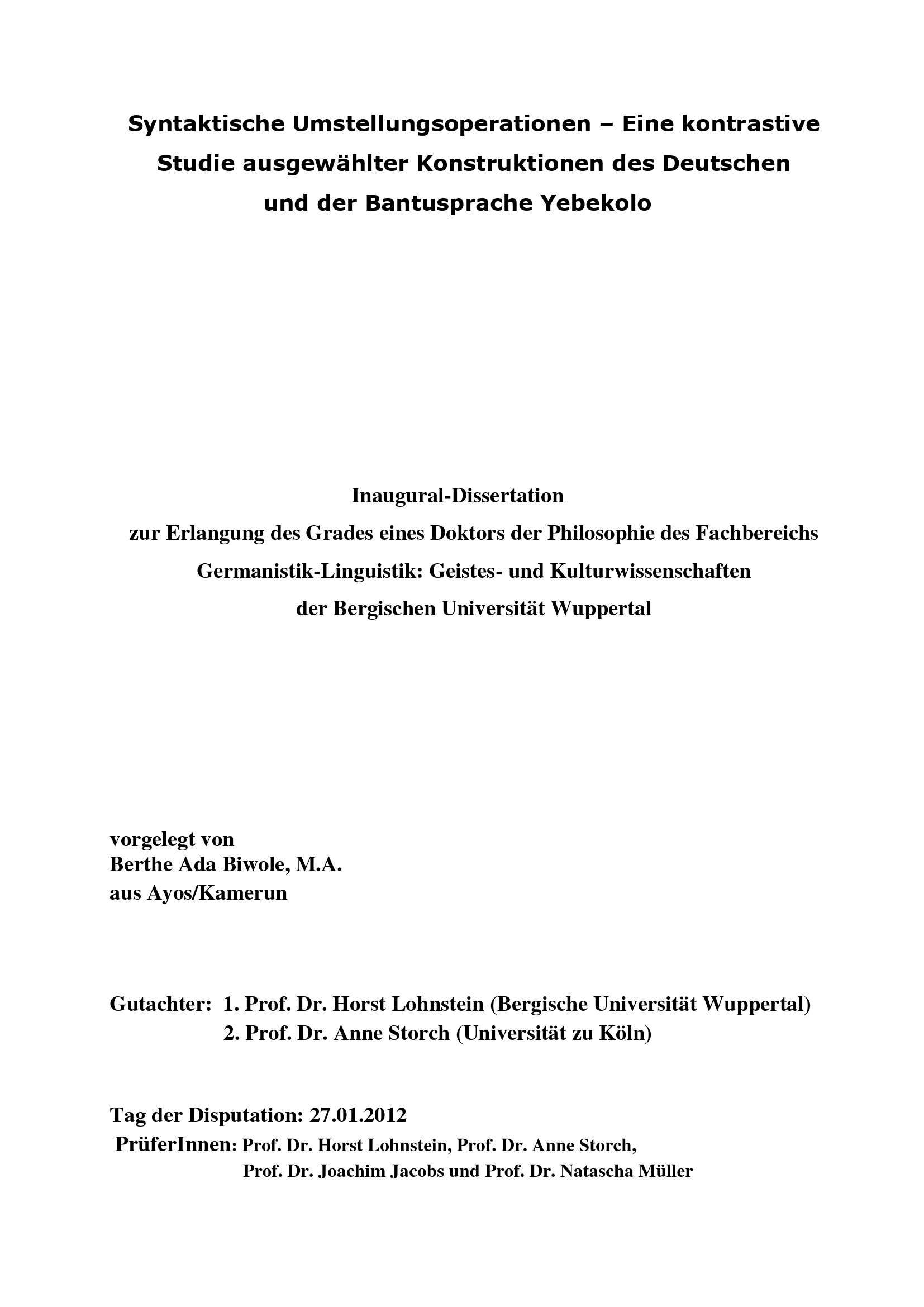 Syntaktische Umstellungsoperationen : eine kontrastive Studie ausgewählter Konstruktionen des Deutschen und der Bantusprache Yebekolo / vorgelegt von Berthe Ada Biwole