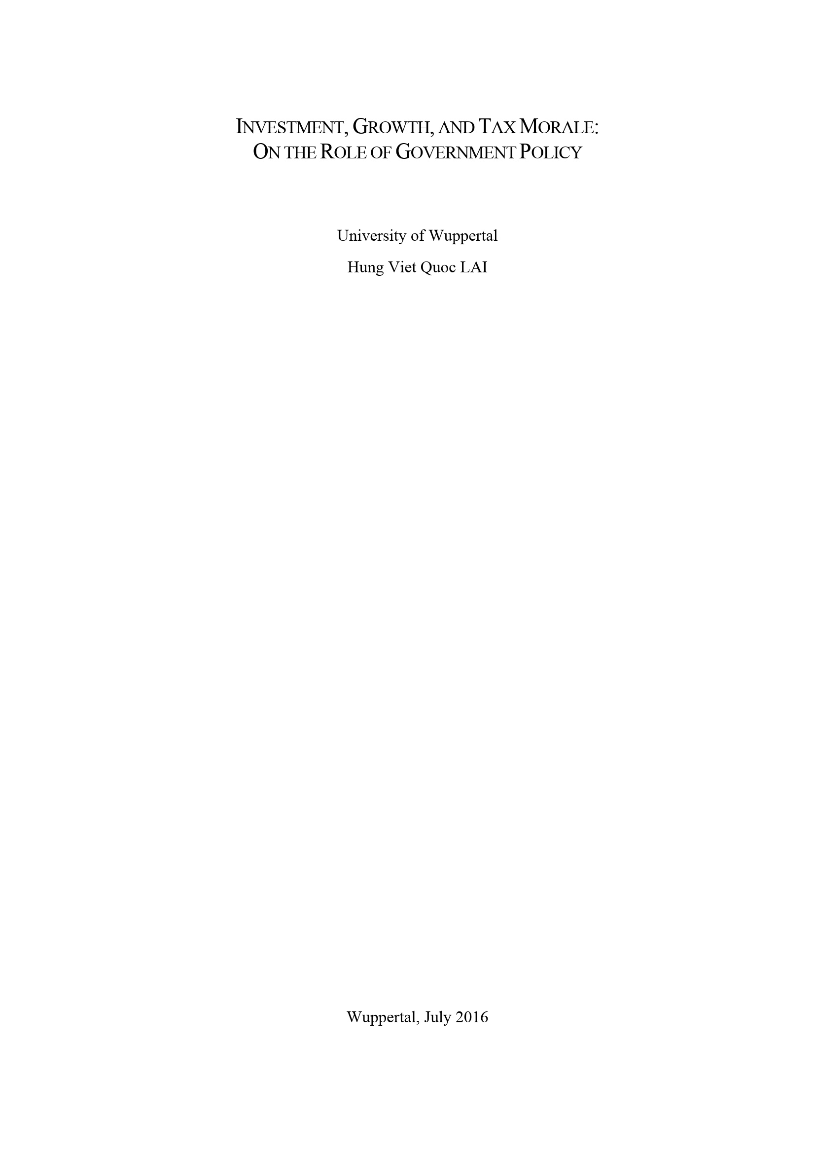 Investment, growth, and tax morale: on the role of government policy / by Hung Viet Quoc Lai, resident in Wuppertal