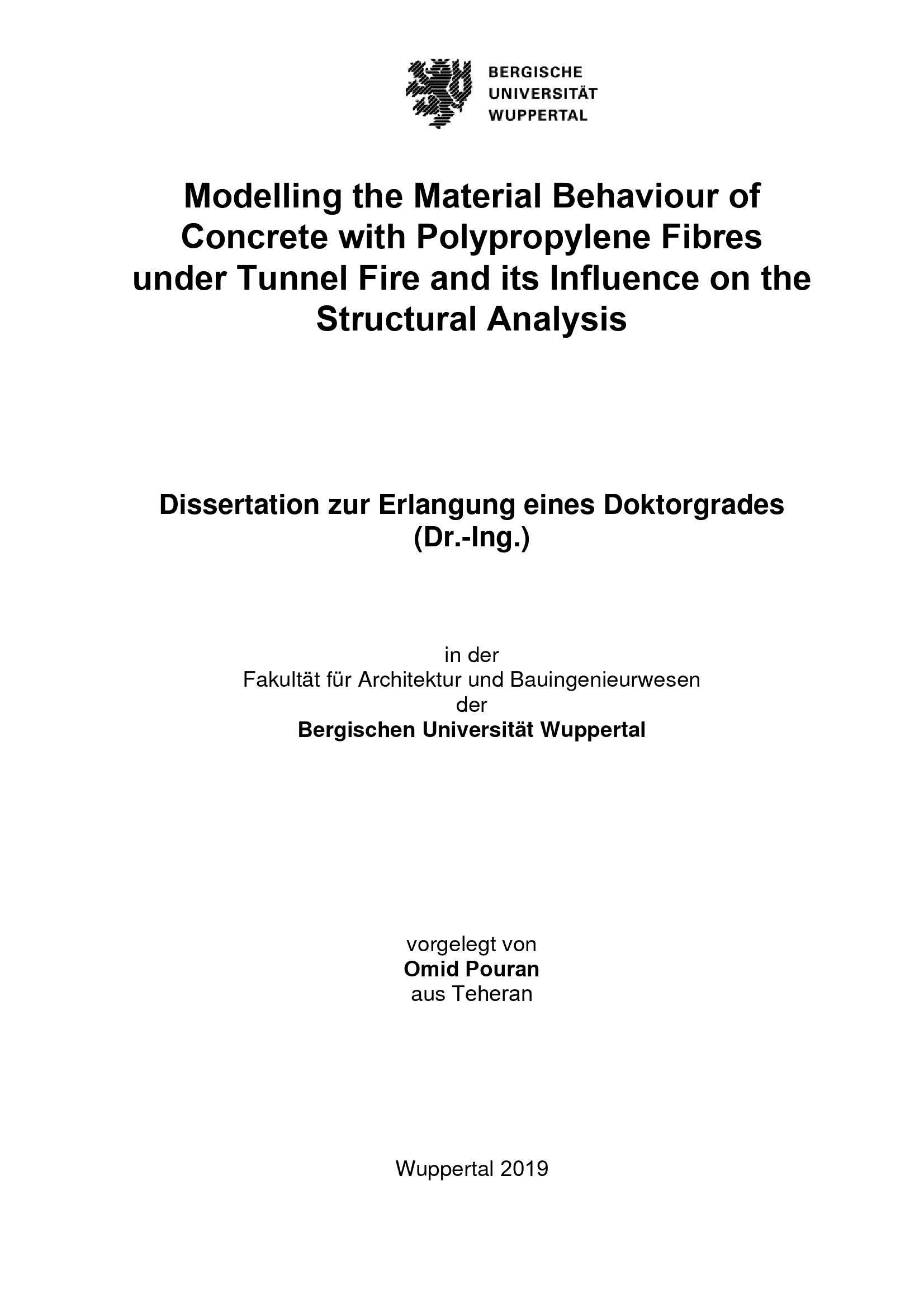 Modelling the material behaviour of concrete with polypropylene fibres under tunnel fire and its influence on the structural analysis / vorgelegt von Omid Pouran aus Teheran