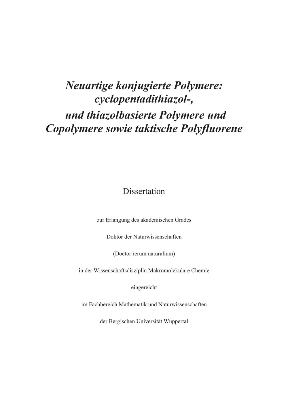 Neuartige konjugierte Polymere : cyclopentadithiazol-, und thiazolbasierte Polymere und Copolymere sowie taktische Polyfluorene / [von Christof J. Kudla]