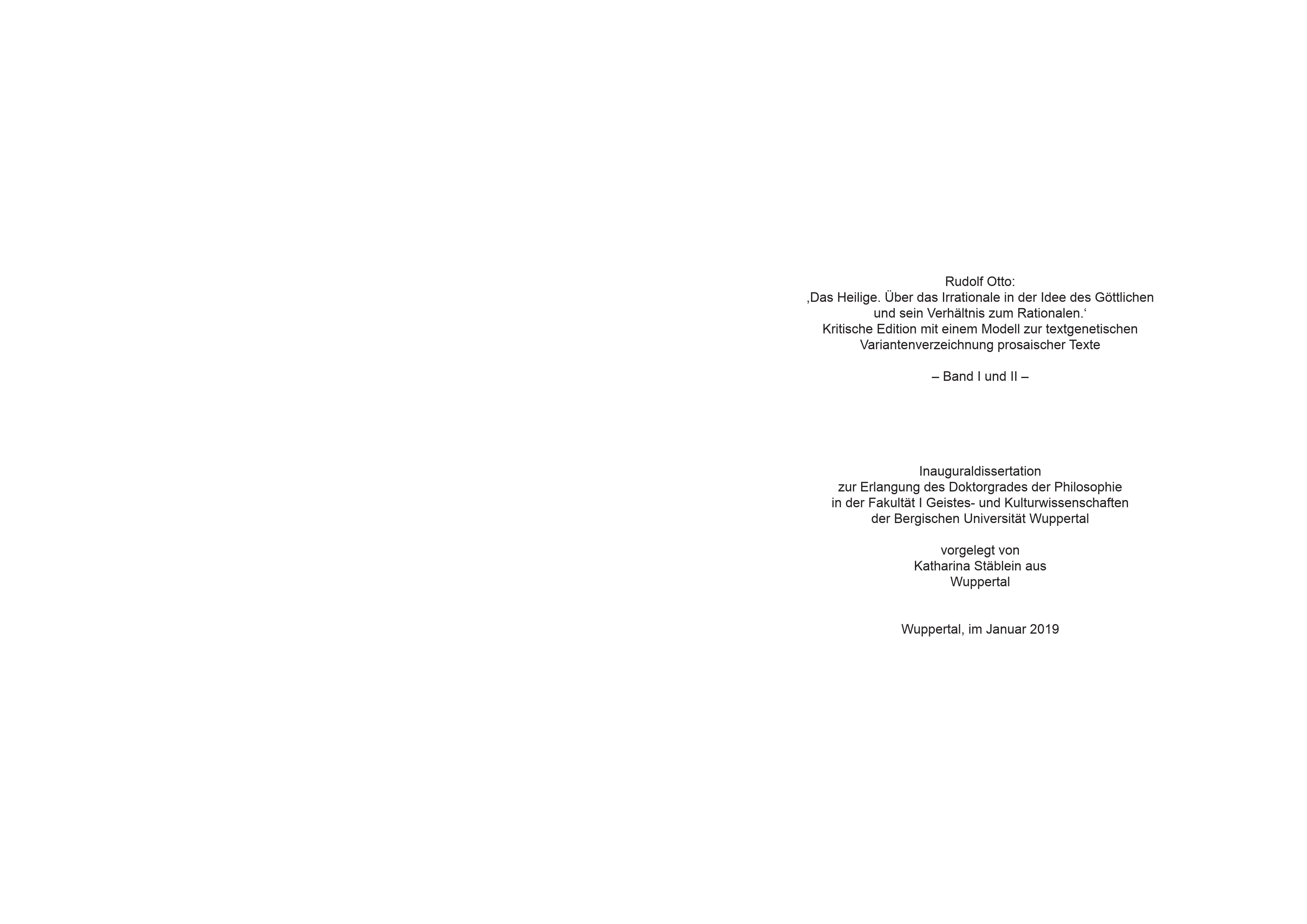 Rudolf Otto: "Das Heilige. Über das Irrationale in der Idee des Göttlichen und sein Verhältnis zum Rationalen." : krtische Edition mit einem Modell zur textgenetischen Variantenverzeichnung prosaischer Texte : Band I und II / vorgelegt von Katharina Stäblein aus Wuppertal