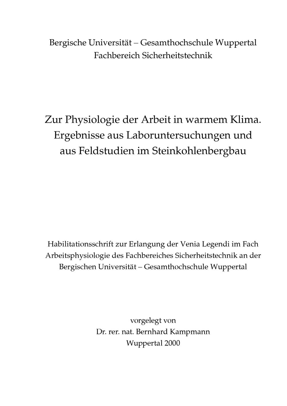 Zur Physiologie der Arbeit in warmem Klima : Ergebnisse aus Laboruntersuchungen und aus Feldstudien im Steinkohlenbergbau / vorgelegt von Bernhard Kampmann
