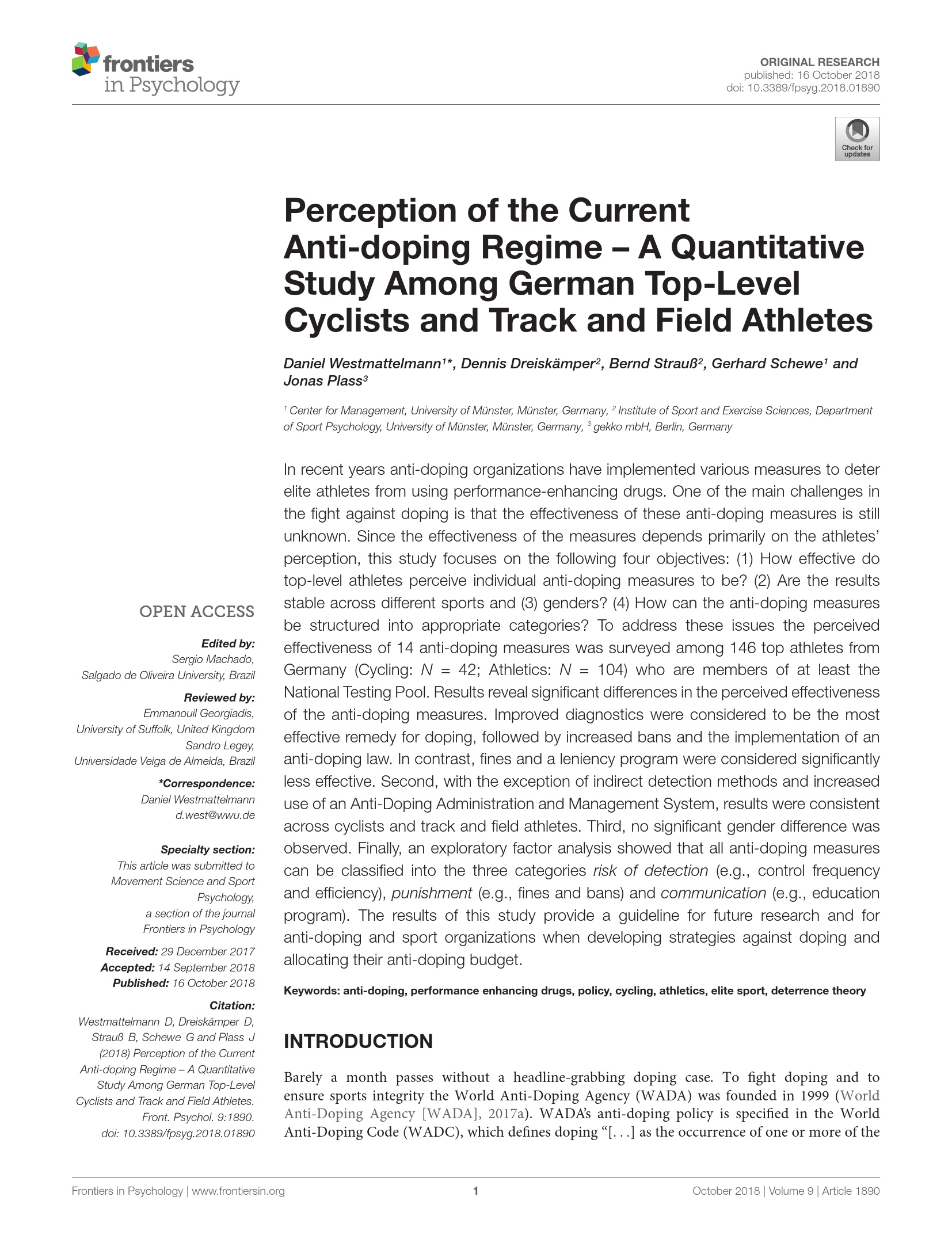 Perception of the Current Anti-doping Regime – A Quantitative Study Among German Top-Level Cyclists and Track and Field Athletes