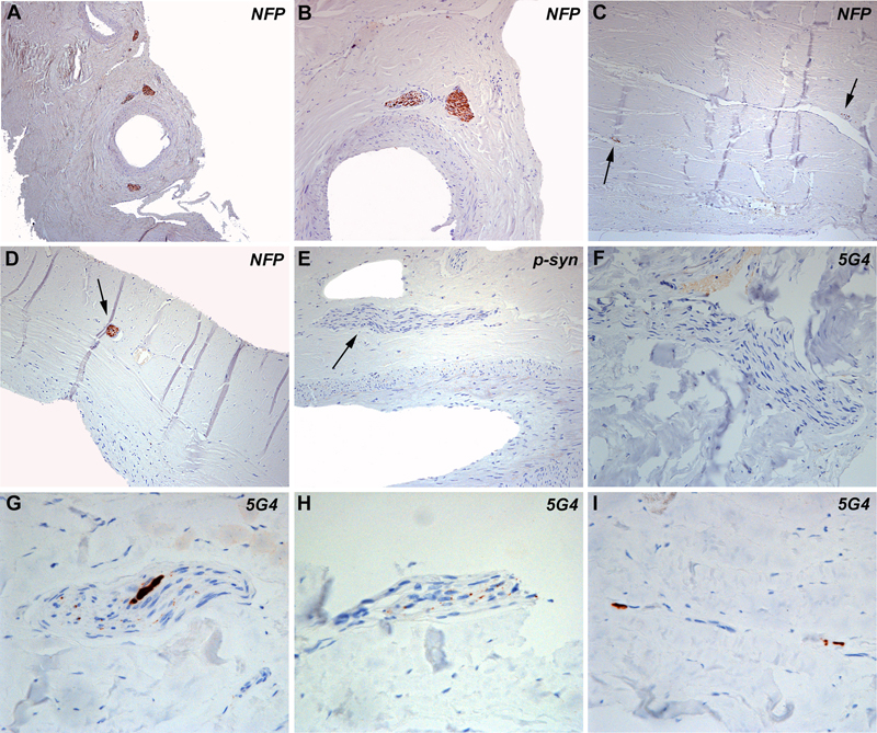 Figure 1 A-D: Histologic appearance of dura mater consisting of two lamellae of connective tissue. Within the connective tissue there are large and small vessels, which are surrounded by nerve fibres (A-D, neurofilament immunohistochemistry). Nerve fibres are also identified between the lamellae and within the connective tissue (arrows). E-I: Immunohistochemistry for phosphorylated alpha-synuclein at serine 129 and for oligomeric forms with the 5G4 antibody did not show abnormal alpha-synuclein aggregates in most of the studied cases (Fig. 1E, F). In one case (case #12 table 1), coarse (G) and punctate (H) aggregates within nerve fibres and perivascular (I) aggregates were identified with the 5G4 antibody. Detailed immunohistochemical analysis of dura samples identified pathological alpha-synuclein aggregates with the 5G4 antibody in one case. These aggregates consisted of small punctate deposits along nerve fibres (Fig. 1H, 2B, D), coarse aggregates (Fig. 1G, 2F) and perivascular deposits (Fig. 1I, 2A). We observed a variable staining intensity of axons among the different cases and also within the same case, which was not related to the presence/absence of alpha-synuclein. This variability might have been related to the fixation time or tissue quality, among other potential variables, so we could not reliably assess axonal preservation in the patient with alpha-synuclein aggregates. We found no tortuous axonal profiles or axonal swellings. This individual was an 85-year-old male with coronary disease with severe and generalized atherosclerosis, an old myocardial infarction, as well as pulmonary adenocarcinoma. No parkinsonism or dementia were clinically reported. Neuropathological examination revealed a vascular encephalopathy and Braak stage 4 Lewy-body pathology, with only mild neurofibrillary pathology in the limbic system and mild neuritic plaque / Aβ pathology (Table 1, case 12). In the remaining cases included in our study, with or without CNS Lewy body pathology, there was a complete lack of alpha-synuclein immunoreactivity in dural samples applying both antibodies.