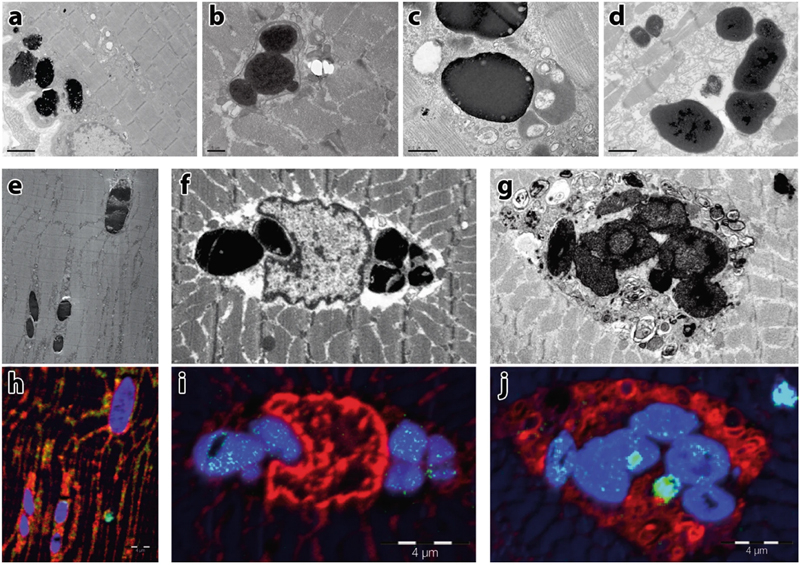 Figure 1. Ultrastructural characterization of sarcoplasmic bodies, the morphological hallmark of myoglobinopathy: Electron micrographs (a–d) show collections of highly electron-dense bodies with some less dense material at their periphery. The sarcoplasmic bodies are seen under the sarcolemma (a), often next to the nuclei. Some sarcoplasmic bodies are surrounded by a membrane (b). Sarcoplasmic bodies of different electron densities are seen near several vesicular structures (c) and were observed in the cardiac muscle obtained post mortem from one of the affected individuals (d). Electron micrographs (e–g) and the corresponding Nanoscale Secondary Ion Mass Spectrometry images (h–j). Blue indicates sulfur (32S), red phosphorus (31P), and green iron (56Fe), respectively. Sarcoplasmic bodies are seen interspersed between the myofibrils (e), next to nuclei (f), or inside an autophagic vacuole (g). Note the high-sulfur signal in the sarcoplasmic bodies (h–j), and the iron signal (green dots within the sarcoplasmic bodies in i, j). Scale bar in a = 2 µm, b = 5 µm, c = 0.5 µm, d = 1 µm, h–j = 4 µm. [This figure and its legend were adopted from Figure 5 in (Olive et al., 2019); this use is permitted under the Creative Commons Attribution 4.0 International License.] A different, purely genetic approach was used to define a new autosomal recessive form of limb-girdle muscular dystrophy that is caused by biallelic mutations in POPDC3 gene: 5 affected individuals from 3 different families were identified via exome sequencing of a cohort of 1500 patients with presumed genetic limb-girdle weakness and elevated creatine kinase levels; their muscle biopsies showed dystrophic features of variable severity (Vissing et al., 2019). POPDC3 (Popeye domain containing 3) gene encodes a membrane protein that regulates cAMP signaling, is highly expressed in skeletal and cardiac muscles, and has not yet been associated with any human disease. Interestingly, patients with POPDC3 mutations do not show a cardiac phenotype, while mutations in two other members of the same gene family (POPDC1 and POPDC2) cause a cardiac phenotype (generally a conduction disorder) accompanied by a variable skeletal muscle involvement (De Ridder et al., 2019; Vissing et al., 2019). The pathogenesis of this new disorder remains to be elucidated; however, initial studies suggest a loss-of-function mechanism that leads to altered cAMP modulation. 2. Emerging therapy-related diseases Introduction of new therapies has led to the emergence of unusual or completely novel NMD phenotypes; in 2019, two new NMD categories, previously described only in individual case reports or small case series, have been more thoroughly defined. Immune-checkpoint inhibitor therapy has revolutionized treatment of patients with advanced cancers, but is often associated with immune-related adverse events (irAEs) that most commonly affect the skin, GI tract, and endocrine glands, as well as the PNS. Neuromuscular irAEs can be severe and include myasthenia gravis (irMG), myopathy (irMyositis), and peripheral neuropathy (irNeuropathy; most commonly acute demyelinating polyradiculoneuropathy) (Johansen et al., 2019; Mohn et al., 2019; Psimaras et al., 2019). While these neuromuscular irAEs share some commonalties with their sporadic counterparts, several unique features have emerged. For example, up to 25% of the patients show more than one neuromuscular irAE, with the combination of irMG and irMyositis encountered most often (Johansen et al., 2019). Furthermore, irMG is more likely to be negative for AChR antibodies than idiopathic MG, while irMyositis is more likely to involve oculomotor and bulbar muscles than any of idiopathic inflammatory myopathies (IIMs); these features make clinical distinction between irMG and irMyositis difficult in many cases (Johansen et al., 2019; Mohn et al., 2019). In addition, irMyositis often involves axial muscles, while IIMs do not (Touat et al., 2018). Finally, a significant fraction of patients with irMyositis shows cardiac involvement, which is not typically seen in IIM patients and has a poor prognosis (Anquetil et al., 2018; Johansen et al., 2019; Mohn et al., 2019). Interestingly, while the rates of irNeuropathies (as well as the overall irAE rates) are higher in patients treated with ipilimubab (the anti-CTLA-4 antibody), irMG and irMyositis are particularly common in patients treated with nivolumab or pembrolizumab (the PD-1 blocking antibodies) (Mohn et al., 2019). The pathogenesis of neuromuscular irAEs is incompletely understood, but is thought to involve both type IV (T cell-mediated) and type II (antibody-mediated) immune mechanisms (Psimaras et al., 2019). On a tissue level, irMyositis can take multiple forms but the most commonly observed pattern [perimysial foci of CD8+ T cells and CD68+ macrophages that are associated with necrosis of adjacent muscle fibers; Touat et al. (2018) and Fig. 2] is distinct from the patterns seen in IIMs. Interestingly, in some cases identical clonal CD8+ cells have been detected within the cancer tissue, skeletal muscle, and myocardium, suggesting that cross-reactivity between cancer cells and myocytes plays at least some role in the pathogenesis of irMyositis (Psimaras et al., 2019).