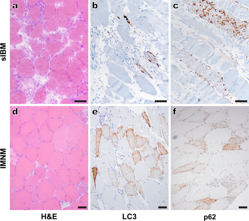Figure 5. Distinct patterns of LC3 and p62 immunostaining in sporadic inclusion body myositis (sIBM) and immune-mediated necrotizing myopathy (IMNM): A typical sIBM case (a-c) shows inflammatory and myodegenerative changes on H&E staining (a) and dense, largely subsarcolemmal protein aggregates and vacuoles on LC3 (b) and p62 (c) immunostaining. In contrast, an IMNM case (d-f) shows randomly distributed degenerating/regenerating fibers and the absence of significant inflammation on H&E (d) and multiple fibers with diffuse, finely punctate staining on LC3 (e) and p62 (f) immunostaining. For both cases, H&E stain was performed on cryosections, while LC3 and p62 immunohistochemistries were performed on formalin-fixed, paraffin-embedded tissue sections. Scale bars, 50 µm. In addition to providing insight into sIBM pathogenesis, these studies have important implications for the sIBM diagnosis and treatment. Of particular interest, the study by Greenberg at al. (2019) included 10 samples from patients diagnosed with polymyositis (PM), an IIM that was historically thought to share the sIBM inflammatory profile but lack its myodegenerative phenotype and its refractoriness to therapy. The existence of PM as a distinct IIM subtype has recently been called into question, given that most patients diagnosed with PM based on the 1975 Bohan & Peter criteria can be reclassified as one of the other IIMs [early stage sIBM, immune-mediated necrotizing myopathy (IMNM), antisynthetase syndrome-associated myositis (ASM), or dermatomyositis (DM)] using the current clinicoseropathologic criteria (Allenbach et al., 2017; Tanboon and Nishino, 2019). However, Greenberg and co-authors have demonstrated an important difference between their “PM” and sIBM samples: while CD8+ lymphocytes invading muscle fibers in sIBM biopsies were abundant and CD57-positive, the CD8+ T lymphocytes invading muscle fibers in “PM” biopsies were sparse and CD57-negative. Additional work will be required to establish whether pathologically diagnosed PM is a distinct (albeit rare) disease entity or whether it corresponds to an early stage of sIBM that lacks senescent, CD57+KLRG1+ TEMRA cells and thus remains responsive to immunosuppressive therapy. Either way, these findings raise a possibility that the presence of CD8+CD57+KLRG1+ T cells in an IIM biopsy could serve as a prognostic marker of resistance to the currently available immunosuppressive therapies, a clinically important application that warrants future study. In addition, expression of KLRG1 by sIBM TEMRA cells may have therapeutic implications: given that this protein is not expressed by central memory T cells and regulatory T cells, it could be used as a basis for development of a future sIBM therapeutic (Greenberg et al., 2019). 6. Immune-mediated necrotizing myopathies: Mechanisms of cell injury mmune-mediated necrotizing myopathies (IMNMs) are a unique class of IIMs for which the consensus clinicoseropathologic criteria were defined at a workshop held in 2016 (Allenbach et al., 2018). IMNMs have been linked to autoantibodies against signal recognition particle (SRP) and 3-hydroxy-3-methylglutaryl-CoA reductase (HMGCR), but approximately one third of cases is seronegative and requires histopathologic diagnosis (Bergua et al., 2019). Regardless of the serologic subtype, pathologic features of IMNM include randomly distributed necrotic and regenerating muscle fibers (Fig. 5d), variable MHC-1 upregulation, sarcolemmal complement deposition, and a scant to absent lymphocytic infiltrate. Previous work has shown that in vitro treatment with either anti-SRP or anti-HMGCR antibodies leads to impaired myoblast fusion and muscle fiber atrophy (Arouche-Delaperche et al., 2017), suggesting that these autoantibodies play a causative role in IMNM pathogenesis. A study from the same group published in 2019 has taken the field a step further by demonstrating the causative effect of these two antibodies in vivo: mice treated with either anti-SRP+ or anti-HMGCR+ patient-derived plasma develop weakness and necrotizing myopathy that closely resembles human IMNM (Bergua et al., 2019). In a further agreement with human disease, muscle deficiency is worse following treatment with anti-SRP than with anti-HMGCR antibodies, but both antisera require functional complement pathway to produce the disease phenotype. Taken together, these studies provide a conclusive evidence for the key role of type II (antibody- and complement-mediated) immune mechanisms in IMNM pathogenesis. Interestingly, target antigens of the two known IMNM autoantibodies (the signal peptide-binding 54 kDa subunit of the SRP ribonucleoprotein complex and HGMCR, the rate-limiting enzyme in the cholesterol biosynthetic pathway) are both expressed in the ER of all cell types (Bergua et al., 2019). Given the ubiquitous expression of these antigens, it remains unclear why anti-SRP and anti-HMGCR antibodies selectively target skeletal muscle in both humans and mice. However, the ER localization of both autoantibody targets may be significant for IMNM pathogenesis: a 2019 study has shown that human IMNM muscle biopsies of any serotype show increased ER stress, activation of the unfolded protein response, and upregulation of the chaperone-assisted selective autophagy (CASA) pathway (Fischer et al., 2019). Notably, activation of the CASA pathway in IMNMs is associated with a unique pattern of immunostaining for autophagy-associated proteins LC3 and p62/SQSTM1: instead of the coarse LC3- and p62-positive vacuoles and protein aggregates seen in autophagic vacuolar myopathies and sIBM [Figs. 5b and 5c; also reviewed in (Margeta, 2019)], IMNM biopsies show diffusely punctate and often quite strong staining of a variable subset of non-necrotic muscle fibers (Figs. 5e and 5f). While it remains to be shown how antibody-mediated cell injury leads to activation of the CASA pathway [the impairment of which plays a role in the pathogenesis of 