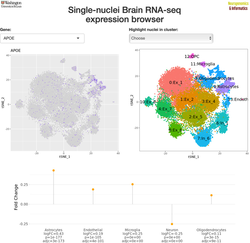 Figure 1. Limbic-predominant age-related TDP-43 encephalopathy (LATE). (A) LATE neuropathological change in an 83-year-old woman with dementia and the clinical diagnosis of AD. Marked atrophy and neuronal loss in the hippocampal formation, but with minimal AD neuropathological change. (B) TDP-43 proteinopathy is shown in the dentate gyrus. Image courtesy of Dr. Peter Nelson (NIH grant P30 AG028383). There is a great deal that we have to learn by studying LATE. While a few genes have been implicated as risk factors (i.e., APOE, GRN, TMEM106B, ABCC9, KCNMB2), larger genetic studies have the potential to better delineate mechanisms and causal pathways that could serve as biomarkers and therapeutic targets. Further, we have very little understanding of the extent to which LATE affects non-Caucasian populations; studying more diverse populations has the potential to expand on risk factors, genetic and otherwise. Biochemical and molecular studies of TDP-43, including secondary modifications such as phosphorylation, have the potential to lead to biomarkers that could be used pre-mortem. Finally, co-morbidities are nearly universal in the oldest-old population, and the extent to which they interact with LATE pathology will be important for understanding its clinical significance. 2. Single-cell transcriptomics Nothing has plagued molecular profiling of post-mortem neurodegenerative disease brain tissue more than the problem of normalization in the context of variable and often massive neuronal loss with commensurate reactive gliosis. Numerous approaches have been developed to address this problem (e.g., deconvolution of bulk RNA sequencing or expression profiling of pooled cells isolated by laser capture microdissection), but they are laborious and results often fall short. Recent advances in high-throughput single cell sorting using microfluidics coupled with next-generation sequencing have enabled a paradigm shift in how gene expression profiles can be investigated. The first papers deploying single-cell RNA sequencing (scRNA-seq) in human post-mortem neurodegenerative disease tissues have emerged in 2019 and we expect this to transform transcriptomic studies (Del-Aguila et al., 2019; Grubman et al., 2019; Mathys et al., 2019). One of the major barriers that investigators encountered in applying single cell technology to human post-mortem brain is that it is not possible to isolate single cells from frozen tissue given the membrane breakdown. Thus, scRNA-seq is currently best done from cells isolated from fresh brain tissue, and precludes using archival frozen banked brains. Previous work in animal models, however, has shown that single nuclei can withstand the freezing process and yield nuclear RNA profiles that can serve as a proxy for those generated from cytoplasmic RNA. Because of this, groups are focusing on this variant approach termed single nuclei RNA-seq (snRNA-seq, or just Nuc-Seq). Three studies were published in 2019 using Nuc-Seq in post-mortem human brain tissue from patients with neurodegenerative disease. In the first, published online in August by Del-Aguila et al, investigators at Washington University in Saint Louis used Nuc-Seq to profile a patient with the PSEN1 p.A79V mutation and compared it to two related family members with sporadic AD (non-mutational), and proposed a collection of best practices (Del-Aguila et al., 2019). All of these studies have made the data available online (Figure 2). In November, Grubman et al., from Monash University (Australia) and Duke-National University of Singapore Medical School, examined the entorhinal cortex from 6 sporadic patients and 6 controls. Their group found that AD is associated with downregulation of APOE in oligodendrocyte precursors and astrocytes, and with upregulation of APOE in a subpopulation of microglia. They also explored transcription factor regulatory modules (Grubman et al., 2019). Finally, in the largest study published in June by Mathys et al., investigators at the Broad Institute of MIT/Harvard profiled the prefrontal cortex from 48 individuals from the Rush ROSMAP cohort and identified sex differences in disease-associated subpopulations of cells, and found interesting recurrent differences in myelination that might play a role in AD (Mathys et al., 2019). Together, these results are the first step towards providing a highly detailed cell-type specific molecular atlas of neurodegenerative diseases.