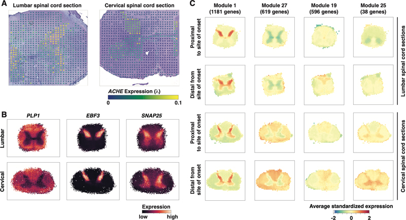 Figure 2. Single-nuclei RNA-seq (snRNA-seq) brain expression browser. Cell type specific expression profiles can be shown using a publicly available interactive web-based resource (http://ngi.pub/snuclRNA-seq). 3. Spatial transcriptomics Essentially all approaches to measuring gene expression are limited by the fact that isolation of nucleic acids from tissue by necessity disrupts the spatial relationship of the cells of interest. Losing the cellular architecture is a major barrier to understanding the context of genome-wide changes in RNA expression. This year we saw the first use of spatial transcriptomics, a method first introduced in 2016 that bridges RNA-sequencing and histopathology by allowing researchers to generate thousands of gene expression profiles from a single histological section using a slide printed with an array of barcoded specialized mRNA-capturing probes (Ståhl et al., 2016). In a study led by Hemali Phatnani at the New York Genome Center and published in Science (Maniatis et al., 2019), spatial transcriptomics was applied to post-mortem human amyotrophic lateral sclerosis tissue from seven patients with either lumbar- or bulbar-onset sporadic ALS (Figure 3). They also profiled SOD1-G93A transgenic mice. Together, they quantitated the spatial distribution of 11,138 mouse and 9624 human genes in spinal cord sections and confirmed the alteration in expression of some known ALS genes. They were also able to identify an abnormal microglial signature that preceded astroglial dysfunction. They chose to follow up on a mechanism involving TREM2 and its partner TYROBP, revealing a spatiotemporal ordering with TYROBP expression upregulated pre-symptomatically before TREM2. Changes in other genes that are part of this mechanism (e.g., APOE, CX3CR1, LPL, B2M and CX3CR1) occurred later. These results demonstrate how this technology can lead to novel insights by being deployed as part of an interdisciplinary approach to neurodegenerative disease.