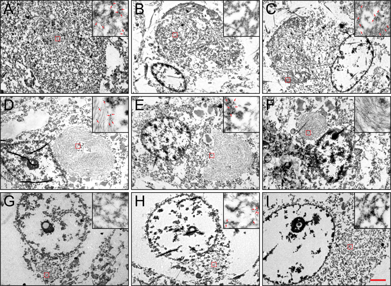 Neuronal eosinophilic (A/B) inclusions in the hippocampus (A/C/E/G) and frontal cortex (B/D/F/H) of Case 3 are negative for FUS (C/D) but positive for TDP-43 (E/F/H), as well as αINX (G/H). α-internexin (brown) and TDP-43 (blue) colocalizes on double-labeling immunohistochemistry (H)[bar:100 μm] Electron and immunoelectron microscopy Results of the electron microscopic examination are shown in Figure 4. In the FUS-positive NIFID cases, we found that FUS was localized to loose granulofilaments that were in close proximity to intermediate filament inclusions that contained tightly packed uncoated filaments unlabeled by FUS antibody. The two types of filaments did not mix. The compact intermediate filament inclusions were similar to those we previously reported(29). In the TDP-positive NIFID case (#3), the TDP-positive NCIs were composed of granulofilaments in tightly packed bundles or loose orientations. Cytoplasmic organelles, e.g. mitochondria, were occasionally encompassed by these inclusions. Figure 4: Electron Microscopy