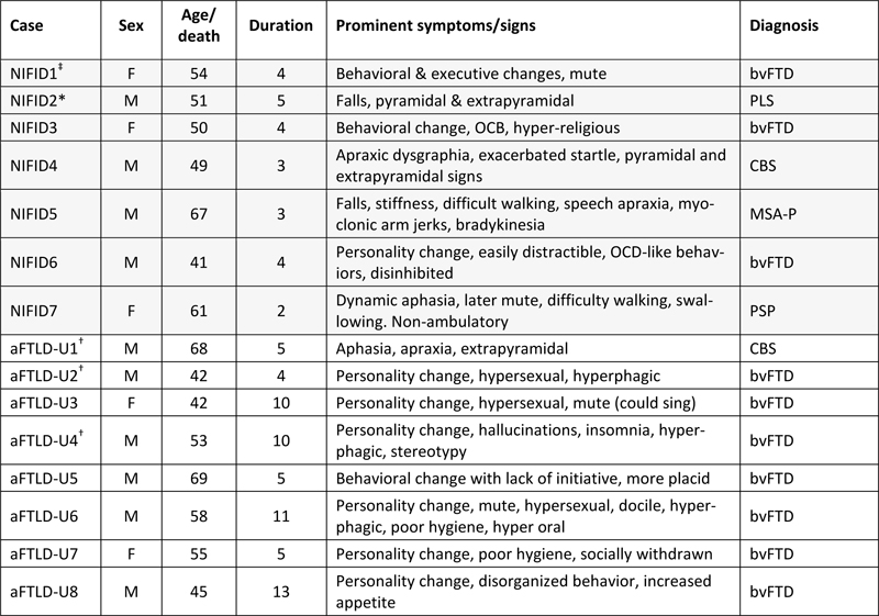 ALS = amyotrophic lateral sclerosis; bvFTD = behavioral variant frontotemporal dementia; CBS = corticobasal syndrome The median age of onset of the NIFID cases was 52 years old (range: 41-61 years) while for aFTLD-U it was 54 years old (range: 42-69 years). Disease duration in NIFID was only 3.5 years (range: 2.0-5.0 years) and was much shorter than the median disease duration of the aFTLD-U group which was 10 years (range: 4-13 years) (P<0.05). The clinical diagnoses were heterogeneous in the NIFID cases, with three cases (43%) diagnosed as bvFTD. On the other hand, of the aFTLD-U cases all but one (88%) had been diagnosed with bvFTD. The NIFID cases were more likely to have had pyramidal tract signs and motor dysfunction compared to the aFTLD-U cases; myoclonic jerks and excessive startle were also observed in NIFID but not aFTLD-U. Pathological findings Gross examination All 15 cases had evidence of frontal and temporal lobe atrophy, and hence all met criteria for FTLD. Striatal atrophy was observed in nine of the 15 cases (Table 2, Figure 1). Table 2: NCI immunohistochemical profile in 15 aFTLD-U and NIFID cases