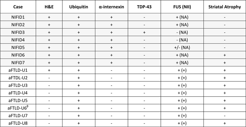 Abstract Background: The majority of cases of frontotemporal lobar degeneration (FTLD) are characterized by focal cortical atrophy with an underlying tau or TDP-43 proteinopathy. A subset of FTLD cases, however, lack tau and TDP-43 immunoreactivity, but have neuronal inclusions positive for ubiquitin, referred to as atypical FTLD (aFTLD-U). Studies have demonstrated that ubiquitin-positive inclusions in aFTLD-U are immunoreactive for fused in sarcoma (FUS). As such, the current nosology for this entity is FTLD-FUS, which is thought to include not only aFTLD-U but also neuronal intermediate filament inclusion disease (NIFID) and basophilic inclusion body disease. Introduction The pathological term frontotemporal lobar degeneration (FTLD) assumes the presence of focal frontal and anterior temporal lobar atrophy(1). Histologically, the majority of FTLDs are pathologically classified into two broad categories of tau-positive FTLD (FTLD-tau) and TDP-43-positive FTLD (FTLD-TDP) based on the presence of tau and TDP-43 immunoreactive inclusions, respectively(2, 3). A subset of FTLD cases however, lack tau and TDP-43 immunoreactivity, and instead have neuronal inclusions that are immunoreactive to ubiquitin(4). Such cases have been referred to in the literature as atypical FTLD with ubiquitin inclusion (aFTLD-U)(5). In the past decade, immunohistochemical studies have revealed that the ubiquitinated protein in cases of aFTLD-U is the fused in sarcoma (FUS) protein(6). Interestingly, there are two other relatively rare FTLD pathological variants that also have neuronal inclusions that are immunoreactive to FUS(7, 8). These include the entity neuronal intermediate filament inclusion disease (NIFID)(9), previously known as neurofilament inclusion body disease(10), and basophilic inclusion body disease(11) that have also been referred to as the generalized variant of Pick’s disease(12). As a result, aFTLD-U, NIFID and basophilic inclusion body disease are all currently classified as subtypes of FTLD-FUS(3, 13). In keeping with pathologically lumping these three entities as FTLD-FUS, is the fact that all three subtypes of FTLD-FUS, particularly aFTLD-U and NIFID, are strongly associated with a clinical presentation of the behavioral variant of frontotemporal dementia (bvFTD)(13-15). Basophilic inclusion body disease is more strongly associated with the juvenile form of amyotrophic lateral sclerosis(16). In addition, aFTLD-U and NIFID have both been found to be associated with striatal atrophy on MRI(17, 18). Hence, aFTLD-U and NIFID have a lot of features in common. One study has directly compared aFTLD-U and NIFID(19). Hence, little is known about which clinical and pathologically differences between the two variants may further help to distinguish them, and whether all cases of aFTLD-U and NIFID do indeed show FUS immunoreactivity. In this study, we set out to address these two unknowns in a cohort of 15 FTLD cases that including aFTLD (n=8) and NIFID (n=7). Materials and methods Subject selection The neuropathological databases at the Mayo Clinic, Jacksonville, Florida were queried to identify all cases of FTLD that had been given a pathological diagnosis of NIFID or aFTLD-U. A total of 15 cases were identified. All 15 cases were evaluated by a single expert neuropathologist (DWD). Clinical data The medical records of all 15 cases were reviewed by one clinician with expertise in neurodegenerative diseases (KAJ) to abstract demographic and clinical information. Data abstracted included sex, age at onset, prominent symptoms during the disease course, family history of any neurodegenerative diseases and final clinical diagnosis prior to death. Pathological methods All 15 cases underwent histologic and ultrastructural evaluation. Tissue sections were stained with hematoxylin and eosin, Luxol fast blue-periodic acid Schiff (LFB-PAS) and Bielschowsky silver stains. Immunohistochemical staining was performed using standard methods. The deparaffinized and rehydrated sections were steamed in distilled water for 30 min and immunostained in batches to assure consistency with a DAKO Autostainer (DAKO, Carpinteria, CA) using 3, 3’diaminobenzidine as the chromogen. After immunostaining, the sections were lightly counterstained with hematoxylin. The following antibodies were used: phosphorylated neurofilament (SMI-31, 1:20,000; Covance, Berkeley, CA); ubiquitin (mouse monoclonal Ubi-1, 1:40,000; EnCor Biotechnology, Alachua, FL; rabbit polyclonal UBQ(20), 1:500 and rabbit polyclonal UH-19(21), 1:2,500); phospho-tau (CP13, 1:100; Peter Davies, Albert Einstein College of Medicine, Bronx, NY); alpha-synuclein (NACP(22), 1:3,000), alpha-internexin (1:100; EnCor Biotechnology, Alachua, FL); TDP-43 (MC2085, Dr. Petrucelli, 1:1500), pTDP-43 (S409/410, Cosmo Bio Co., 1:5000) and rabbit polyclonal anti-FUS (1:500; HPA008784; Sigma, St. Louis. MO and Bethyl Lab; A300-302A; Montgomery, TX). The Sigma antibody gave consistent and better staining and was used throughout the study. The presence or absence of motor neuron disease was assessed and defined as previously described, including stains for activated microglia(23). Electron microscopy Small pieces of formalin-fixed brains were immersed in 2.5% glutaraldehyde-0.1 M cacodylate buffer overnight at 4°C. After washing in buffer, they were post-fixed in aqueous 2% osmium tetroxide for 1 hr, washed and fixed in 1% uranyl acetate-50% ethanol for 30 min, followed by dehydration in 70%, 80%, 95%, 100% ethanols and propylene oxide. They were infiltrated and embedded in Epon 812. Thin sections were stained with uranyl acetate and lead citrate and examined in a Philips 208S electron microscope fitted with a bottom-mount CCD camera (Orius 831, Gatan, Pleasanton, CA). Immunoelectron microscopy Small pieces of formalin-fixed brains were dehydrated in serial washes of 30%, 50%, 70%, 90% ethanol for 10 min each, infiltrated and embedded in LR White resin. They were polymerized in a