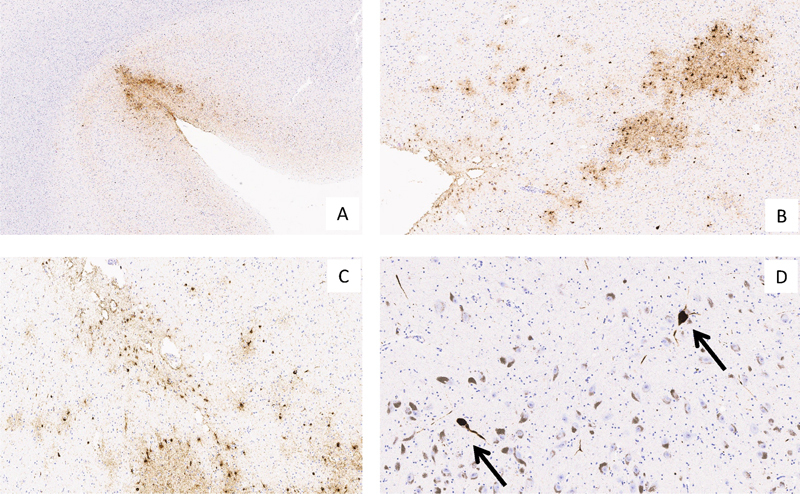 Figure 2. Characteristic tau neuropathology features of chronic traumatic encephalopathy (CTE), including: A. depth of sulcus involvement, B,C. perivascular foci with involvement of neurons and astrocytes, and D. neurofibrillary tangles in substantia nigra, pars compacta neurons (arrows). Hyperphosphorylated tau immunohistochemistry (AT-8) in a former collegiate American football player. First and foremost, one needs to recognize that rodent tau is different from human tau and there has been an almost universal failure, under any experimental condition, to induce tau aggregates comparable to human neurofibrillary tangles in wild-type mice. Accordingly, both groups used a humanized mouse transgenic model with knock out of the expression of the native mouse tau, in the hopes that this maneuver would enhance their chances of inducing such changes. In the Gangolli et al. (Gangolli, Benetatos et al. 2019) experiment, head trauma was produce using the Closed-Head Impact Model of Engineered Rotational Acceleration (CHIMERA) approach. CHIMERA is a relatively newly developed technology that is capable of producing both concussive and subconcussive injury to experimental animals and also produces a significant rotational acceleration component (Namjoshi, Cheng et al. 2017). Mice were exposed to 20 daily impacts for 20 consecutive days and the energy used for the CHIMERA impact was controlled to yield animals with either a subconcussive or concussive level of injury. All animals underwent behavioral testing at 3 months and 12 months post-injury and were sacrificed for morphologic and biochemical studies at the later time period. Behavioral abnormalities were seen in both the subconcussive and concussive-exposed animals (more prominent following the higher energy impact model) and this was accompanied by evidence of white matter disruption. Importantly, there was no evidence of tau pathology in any of the injured animals. Clearly, these experiments demonstrated that repeated exposure to head trauma through the CHIMERA approach could induce white matter damage, important in and of itself, but this failed to induce a model that could be used in studying the underlying tau-related pathophysiology of CTE. The Mouzon, et al. paper (Mouzon, Bachmeier et al. 2019) reports exposing humanized transgenic mice to closed-head impact injury with either a single blow or 5 successive blows over a ten day interval (48 hours apart). The animals were then allowed to survive for either 24 hours or 12 months, post-injury. Evaluations included behavioral testing and, on sacrifice, morphologic and biochemical assays. The behavioral testing showed persistent and progressively worsening deficits in visuospatial learning from 2 to 12 months and significant deficits in visuospatial memory consolidation at 12 months post-injury. Neuropathologic evaluation at both 24 hours and 12 months revealed evidence of axonal injury, thinning of the corpus callosum and activation of microglia and astrogliosis in the white matter. Tau immunohistochemistry and ELISA studies showed an increase in phosphorylated tau in the cortex at the site below the impact point and in the CA1/CA3 region of the hippocampus of both the single and repeated injury mice. However, this response was transitory in the immediate post-injury (24 hours) phase and was not detected at the 12-month survival time period. No neuronal tau aggregates were detected in the injured animals. The authors point out that the “post-TBI neuropathology in hTau and WT mice was otherwise comparable, with essentially similar levels of axonal injury and chronic neuroinflammation in both study groups.” They further suggested that the observation of transient tau hyperphosphorylation at acute time periods post-injury “may be a normal physiologic response of the brain to mTBI.” Both articles failed to show that the use of humanized tau mice with repeated impact TBI was able to develop a rodent model of CTE and thus their results could not be used to mimic the human disease. In my opinion, despite considerable effort, the neurotrauma field has yet to identify a consistent and valid animal model of CTE. Characterization of Tau Filaments in Chronic Traumatic Encephalopathy Cases by Cryo-Electron Microscopy Cryo-electron microscopy is a technology that is capable of imaging the three-dimensional structure of complex biomolecules at the single digit Angstrom level of resolution. This newly developed approach is so powerful, that its developers, Drs. Jacques Dubochet, Joachim Frank and Richard Henderson, were honored with the 2017 Nobel Prize in Chemistry for their work. Tau filaments isolated from the brains of patients with Alzheimer’s disease (Fitzpatrick, Falcon et al. 2017) and Pick’s disease (Falcon, Zhang et al. 2018) have been reported using this technique and have been shown to form differing configurations. In 2019, Falcon, et al. (Falcon, Zivanov et al. 2019) reported a cryo-EM study of tau filaments isolated from three cases of CTE (a former American football player and two former boxers). The configuration of the filaments isolated from each of the CTE cases were identical and were distinctly different than that isolated from the Alzheimer’s disease and Pick’s disease brains. In the CTE-derived tau filaments, the β-helix region of the molecule displayed a distinct hydrophobic cavity that was not seen in tau filaments from Alzheimer’s or Pick’s disease specimens. This cavity contained an additional density whose identify has yet to be identified but was thought to be a non-proteinaceous co-factor. These exciting findings serve to define CTE as representing a distinct and different neurodegenerative process from Alzheimer’s disease. In addition, the identity and function of the associated co-factor represents a potentially exciting therapeutic target for patients with CTE. Conclusions In this review a number of studies are presented, some involving clinically rel