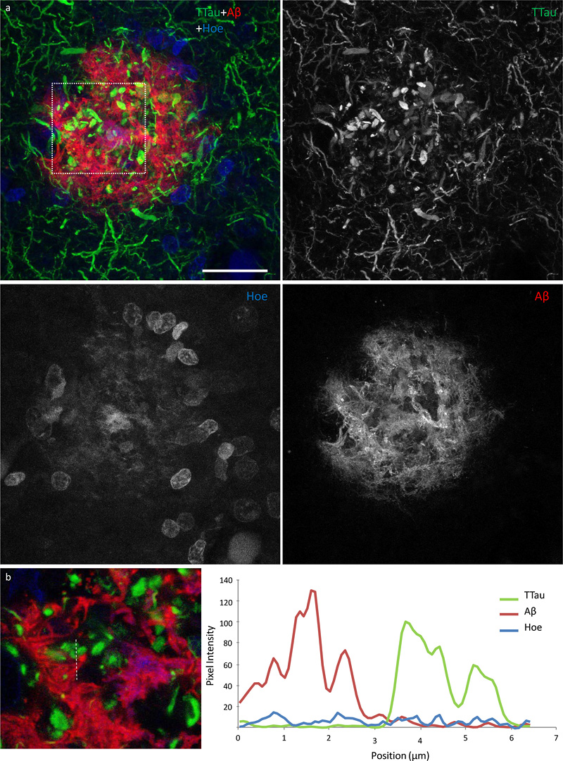 aCells/mm2; mean ± standard deviation. A graded extent of neuritic tau pathology and clustering of microglia occurs within nascent Aβ plaques, with the persistence of dystrophic neurites and the loss of IBA1-immunoreactivity and Aβ-immunoreactivity occurring in established neuritic plaques All of the Aβ plaques examined in the ITC, and a majority in the PMC, contained DNs. However, the extent of the accumulated neuritic tau pathology within each plaque was lower in the PMC (Fig. 4a) than the ITC of the same case (Fig. 4b). Both Aβ deposits and globular DNs were seen perivascularly (Fig. 4c), consistent with previous observations (39). The density of DNs was greatest in the ITC of AD cases (Fig. 4c), which also had the highest density of remnant plaques characterised by accumulations of DNs associated with weak or absent Aβ-immunoreactivity (Fig. 4d). In the ITC a diffuse lattice of elongated NTs occurred throughout the neuropil and independently of Aβ plaques (Fig. 4e). DNs appeared radially projecting from Aβ plaques (Fig. 4e) and showed either elongated or globular morphology (Fig. 5a). Hoechst dye marked cell nuclei around the periphery of Aβ plaques and also partly stained the fibrillar deposits of Aβ (Fig. 5a). Hoechst has previously been reported to stain Aβ plaques in transgenic mice (40). Immunofluorescent double-labelling showed no colocalisation of Aβ and TTau (Fig. 5b).