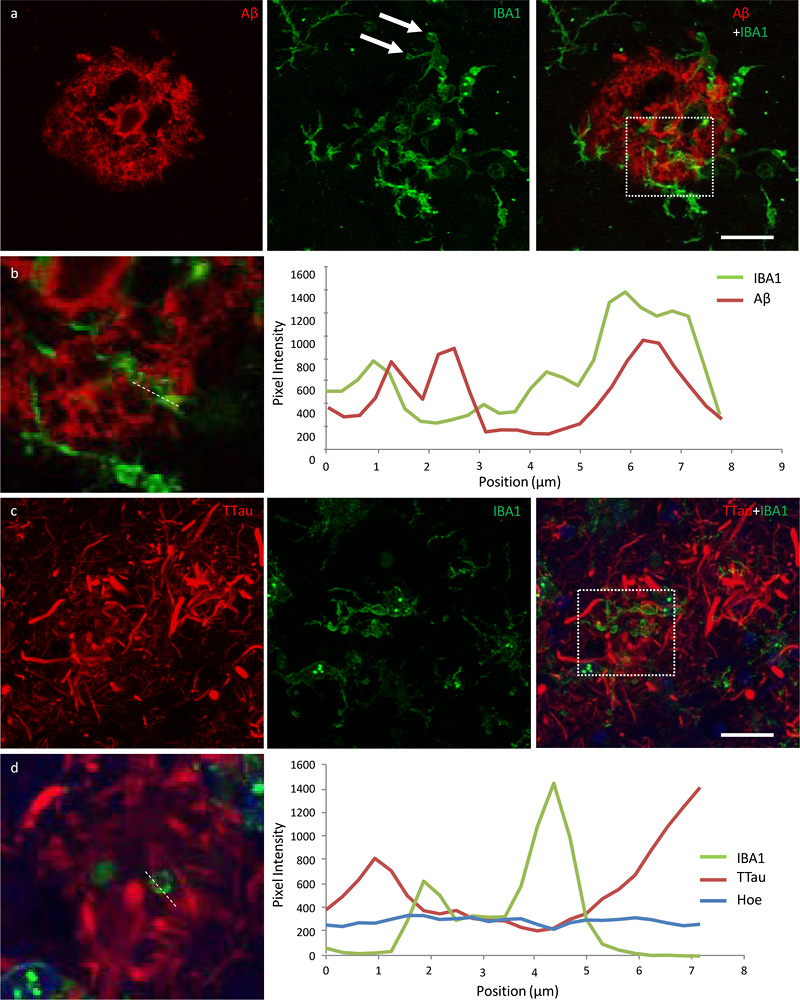 Figure 7 Exemplars from an investigation into the potential internalisation of Aβ and tau pathology by microglia. a Activated microglia in an Aβ plaque in the ITC of a control case with morphological features consistent with the formation of phagosomes (arrows) (M01; dotted box represents region of interest in b). b Coincidence of Aβ and IBA1 pixel intensities along a 7.8 μm length (dotted line) suggests potential internalisation of Aβ by microglia. c Activated microglia in close proximity to tau-positive DNs in the ITC of an AD case (M17; dotted box represents region of interest in d). d There was no evidence of the internalisation of tau pathology by microglia in any of the sections investigated here; exemplar shows Aβ and TTau staining intensities over a 7.2 μm length (dotted line). Scale bar 20 μm (a, c) Discussion AD is a uniquely human disease with a long prodrome and has proved difficult to model. The combination of using different regions of post-mortem brain tissue from individuals with or without dementia and with variable amounts of AD-type pathology may allow the pathological sequence of events to be elucidated. For example, the level of disease severity could be ordered from lowest to highest as follows: PMC-controls < ITC-controls < PMC-HPC < ITC-HPC < PMC-AD < ITC-AD. In particular, regions such as the ITC in HPCs and the PMC in AD cases could harbour the pre-symptomatic targets required to therapeutically delay or prevent AD. Prior to using this model to understand the role of microglia in AD, a quantitative neuropathological analysis of the PMC was carried out to ensure that it met expectations for being a relatively unaffected region of the AD brain. As expected, the PMC of AD cases had a significantly higher % Aβ, Aβ plaque count, % TTau, and NFT density compared controls. There were no NFTs observed in the PMC of controls and HPCs, which also had very similar levels of % TTau (which correlated with increasing age), but differed in their level of % Aβ. HPCs were defined according to standard neuropathological diagnostic criteria – having an intermediate ABC score (38). Incidentally, HPCs and AD cases (intermediate–high ABC scores) were similar in their Aβ load but differed in their tau levels in both regions. In contrast to the primary visual cortex previously investigated (26), the PMC in AD did have significantly reduced levels of Aβ and overall tau pathology, including NFTs as well evidenced elsewhere (41-46), compared to the ITC of the same cases. Overall there was no evidence of neurodegeneration in the PMC of AD cases, unlike the ITC, with cortical thickness, number of total neurons, and giant layer Vb pyramidal Betz cells remaining unchanged as expected (47, 48). Examination of the microglial morphologies in the PMC using the previously validated modified disector sampling approach across all cortical laminae yielded no significant differences between controls, HPCs, and AD cases. However, group differences could be seen locally around AD-type pathology within the cortex with an increase in clustering of activated microglia in the PMC of HPCs compared to controls, and in the PMC compared to the ITC of AD cases. Moreover, a higher percentage of plaques contained clusters of microglia in HPCs than in AD cases and also a portion of microglia clusters that were not spatially associated with Aβ. The presence of a strong microglial clustering response in the PMC of AD cases and in the HPCs aligns with PET imaging studies demonstrating early activation of microglia in preclinical AD cases (49). Although the presence of clusters unrelated to Aβ pathology may be a non-specific observation, it is interesting to note that a previous animal study using a 5×FAD model also reported the presence of microgliosis prior to the formation of insoluble Aβ plaques (50), with another mouse model also indicating microglial activation in relation to synaptic dysfunction prior to Aβ deposition (51). Here it is suggested that clusters of activated microglia in the PMC represent a neuroprotective response correlating with the deposition of Aβ. We have demonstrated clusters of activated microglia that display phagocytic capabilities in the mildly affected PMC before the development of extensive tau pathology. It is conceivable that once the phagocytic potential of microglia is overwhelmed, a transition to a more neurotoxic proinflammatory phenotype occurs and that this represents a pivotal moment preceding tau-related neurofibrillary degeneration. Studies in mouse models of Aβ overexpression suggest proinflammatory microglia, which may be induced by the binding of oligomeric and fibrillar Aβ species to NLR Family Pyrin Domain Containing 3, Receptor for Advanced Glycation Endproducts, Scavenger receptors, and Toll-like receptors, among others (52-58), are associated with poorer cognitive and survival outcomes, have impaired phagocytic capabilities (59), and are capable of secreting an expansive complement of neurotoxic compounds including reactive oxygen species, nitric oxide, peroxynitrite, tumour necrosis factor α, interleukin 1 β, and prostaglandin-E2 (60). However Aβ-independent mechanisms of microglia activation or exhaustion in human AD cannot be excluded and require further research considering the so far limited efficacy of the pharmacological clearance of Aβ in clinical trials (61, 62). Activated microglia tended to be associated with fibrillar NPs, and higher resolution confocal photomicrographs showed evidence of Aβ internalisation by microglia in both regions. The latter may explain the remnant plaques observed here (that contain weak or absent Aβ-immunolabelling; in which higher levels of Aβ were associated with activated microglia, but dystrophic microglia where Aβ-immunoreactivity was very minimal or absent, particularly where dystrophic neurites were extensive) and described elsewhere (14) and is potentially relevant to the proposed dynamic eq