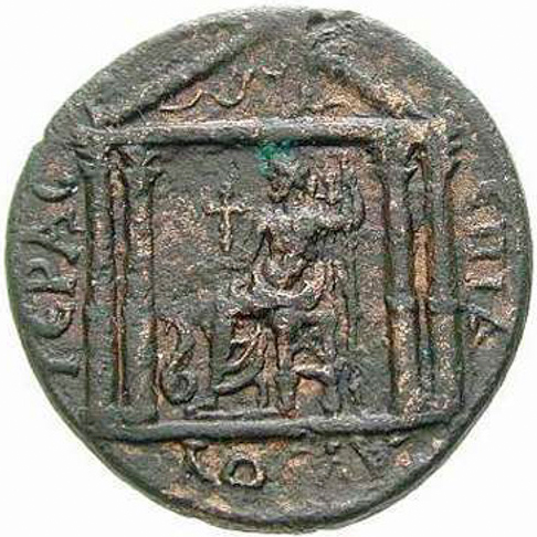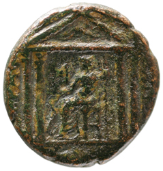 Fig. 11: Coin of Epidaurus, Obv. Antoninus Pius, Rev. Asclepius seated left within tetrastyle temple (Dr. Busso Peus Nachfolger, Auction 378 [2020-04-28] lot 1024)