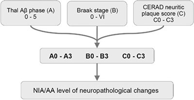 Histopathological examination of the brain has to establish that ADNC are present in sufficient densities and extensions to distinguish AD from other age-related disorders [61]. Because the disease affects the whole brain, it is not sufficient to make the diagnosis of AD just on one or two brain blocks; instead, multiple brain areas have to be examined and a staging protocol has to be established. The current algorithms for the pathological diagnosis of AD are based on semiquantiative assessment of APs and NFTs providing reasonable interrater agreement when using standardized criteria [228]. Current guidelines include (a) cut-off quantitative values for APs and tangles [17, 229]; (b) the semiquantitative assessment and age-adjustment of NPs in the Consortium to Establish a Registry for Alzheimer's Disease (CERAD) protocol [230]; (c) topographic staging of neuritic/tau pathology [18], re-evaluated by immunohistochemistry [231]; and (d) the progress and distribution of Aβ phases [79]. In order to develop a system that combines all the above pathological features, the NIA/AA established a composite score comprising the extent of involvement/spread of cerebral Aβ based on the progression model by the Thal phases: (A), that of NFTs based on the progression model of Braak, (B), and the CERAD score, which describes the density of neuritic amyloid plaques based on certain key locations in the neocortex, (C) (Table 1). From this combination, it gave a likelihood for the degree of AD neuropathological changes in an individual case. Sufficient agreement in AD diagnosis could be reached only when the lesions are considerable (Braak NFT stage V and VI) with 91% agreement, while for mild lesions it was poorer (for Braak stage I and II, agreement was only around 50%) [228, 232, 233].